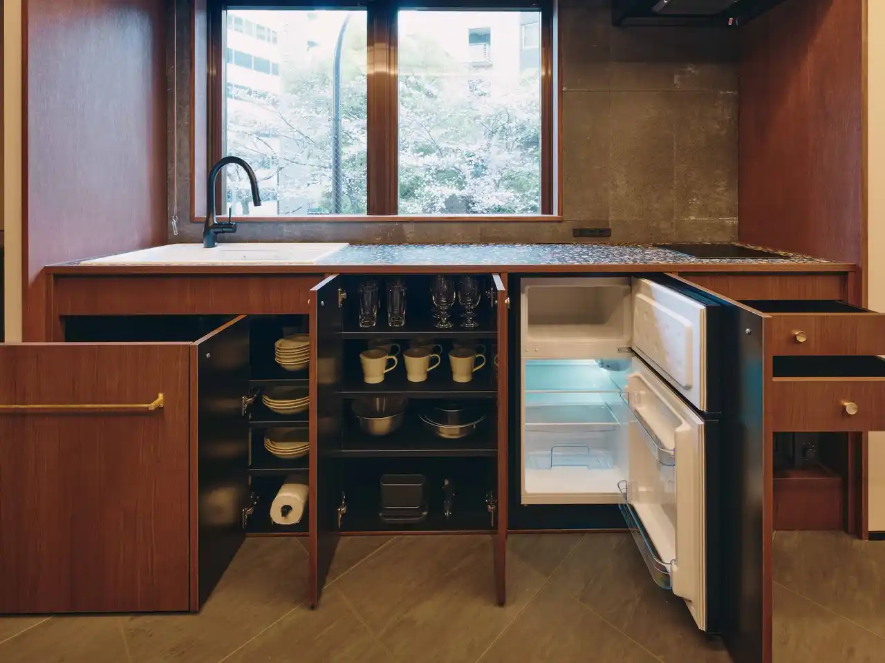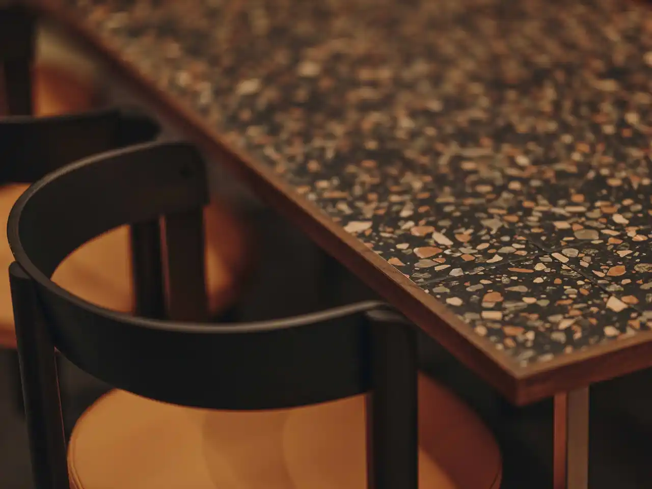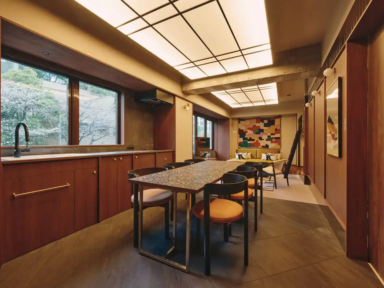 キッチンカウンターやダイニングテーブルには、テラゾータイルを使用。シックなウォールナットの色彩を基調とする部屋に、不規則なタイルのデザインが楽しさと素材感を添える。 |