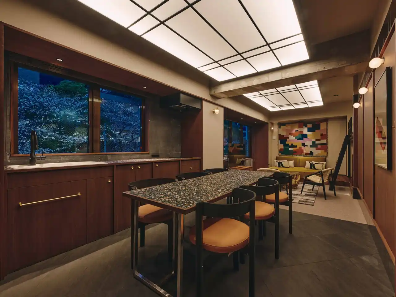日が暮れると、虎ノ門の夜景と室内の柔らかな照明のコントラストが美しい、静寂に包まれる空間へ。まるで月明かりのように影を作らず全体を照らす光天井は、人々の表情をふんわりと描き、会話の温度をそっと上げてくれる。 |