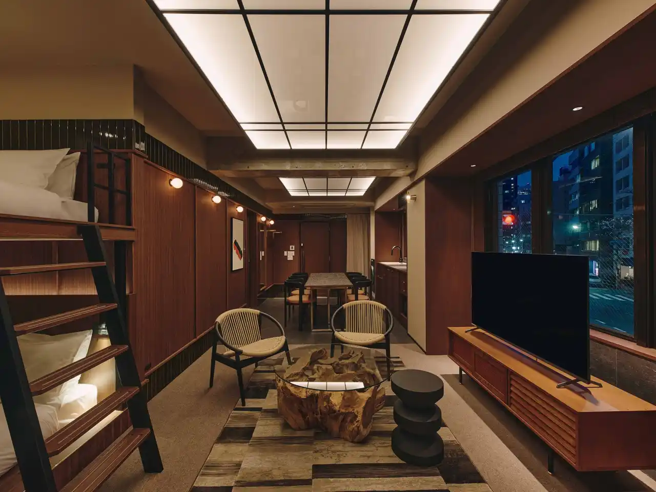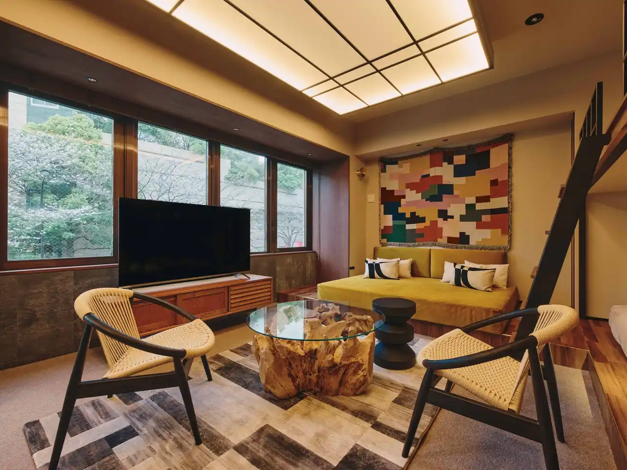大きな窓から自然光が降り注ぎ、虎ノ門の街並みと溶け合う開放的な空間。部屋の中央奥に配されたマスタードイエローのソファベッドは、この部屋における「くつろぎの特等席」として、日常の延長にあるような温かな居場所をつくり出す。 |