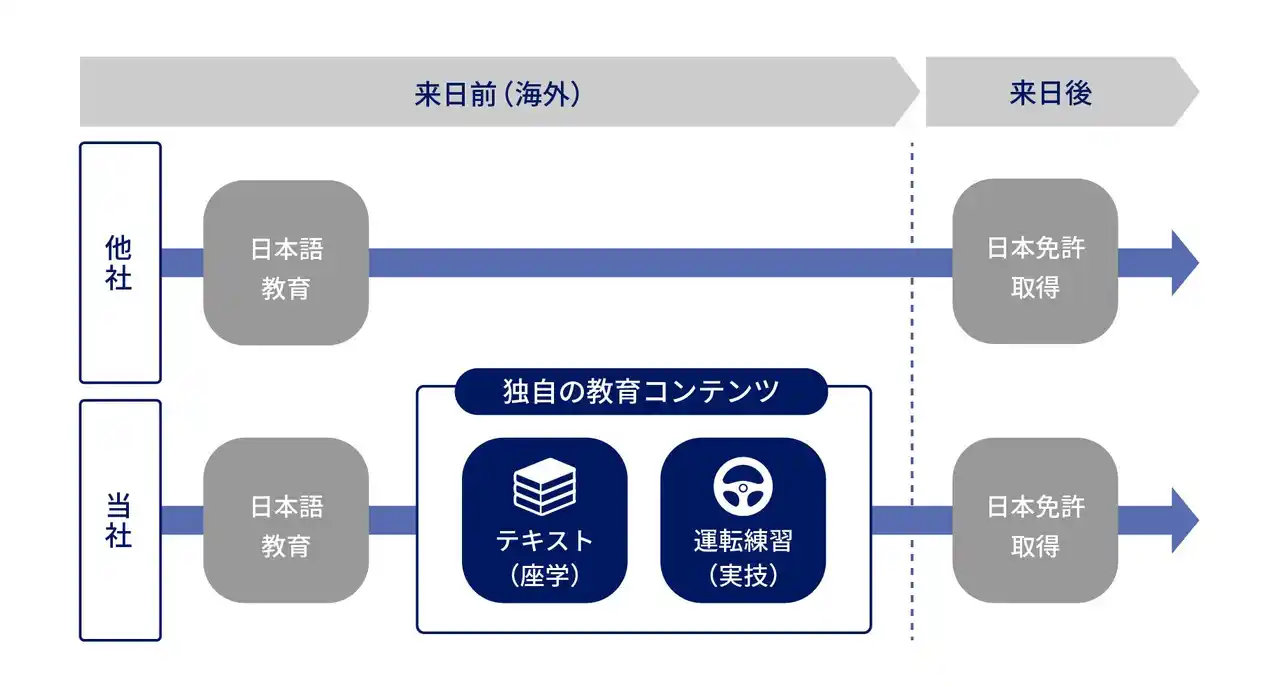 教習所系登録支援機関が実現した来日前に日本式の座学と技能を実施する国内最高水準の教育スキーム概略図 |