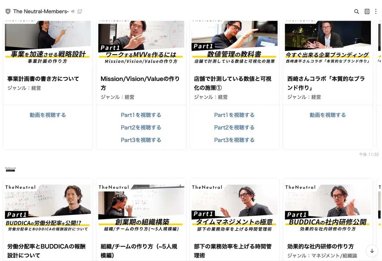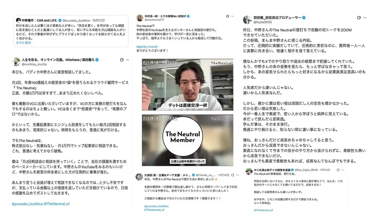 「評価制度とか報酬制度のようなニッチな経営の話って、YouTubeではなかなか紹介されてなかったんですけど、The Neutralに入ったら、それが動画で全部見れるようになってて驚きました。特に、CXOチームの作り方とか、経営幹部一人ひとりにミッションと役割を持たせる考え方はめちゃくちゃ参考になって、実際に自分の会社でも導入しました。組織図も作り直して、会社の伸び方も明らかに変わった実感があります。」 |