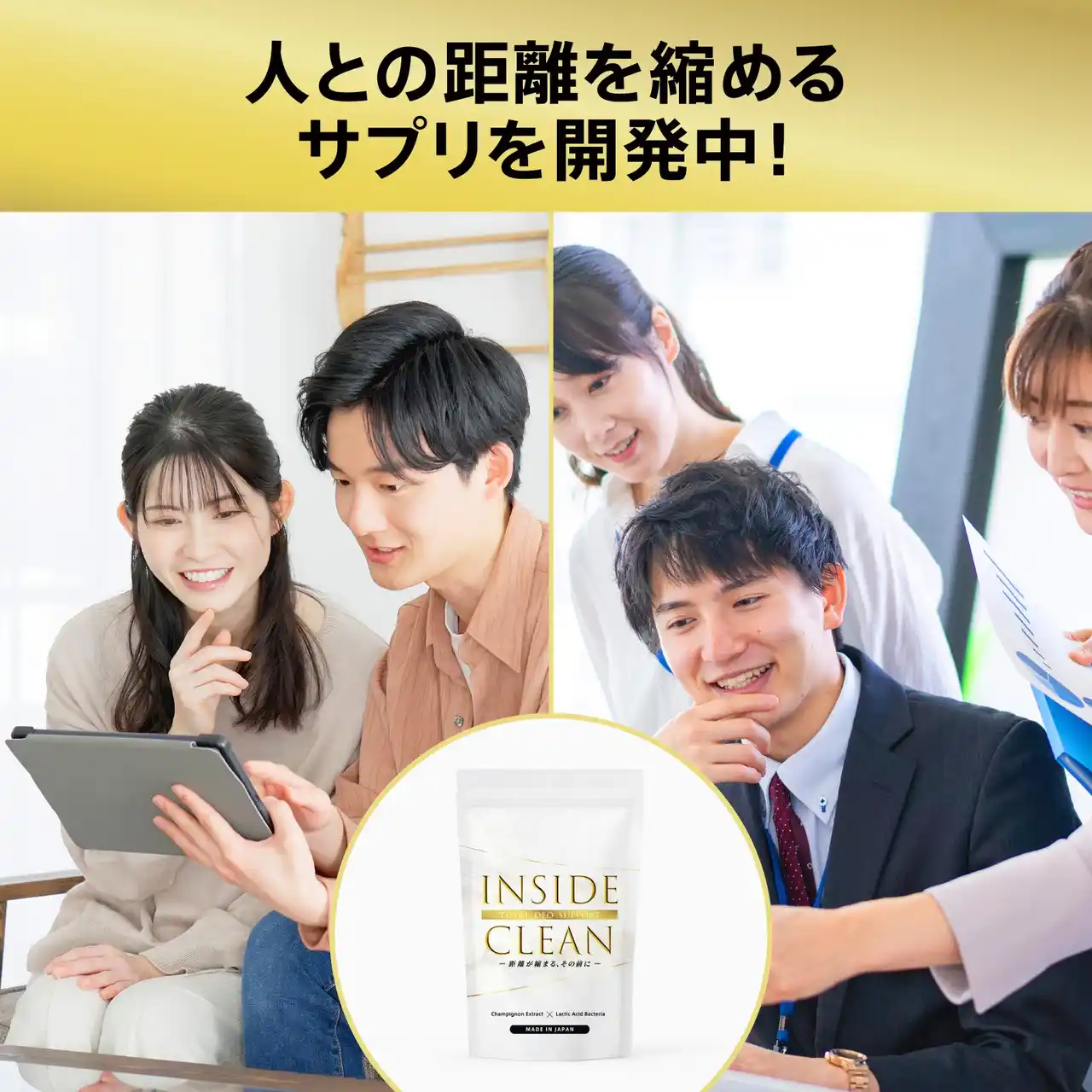 | 腸内の腐敗物質に着目した体臭・口臭ケアサプリメント。150倍濃縮シャンピニオンエキスと、23種・約5兆個の乳酸菌が腸内環境を整える。「距離が近づく、その前に」をテーマに新エチケット習慣を提案します。 |