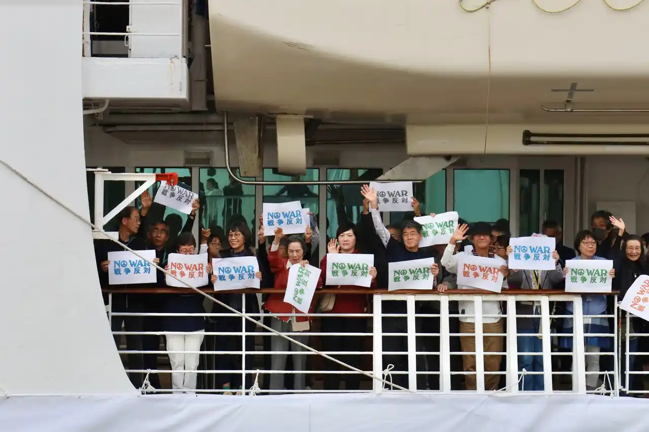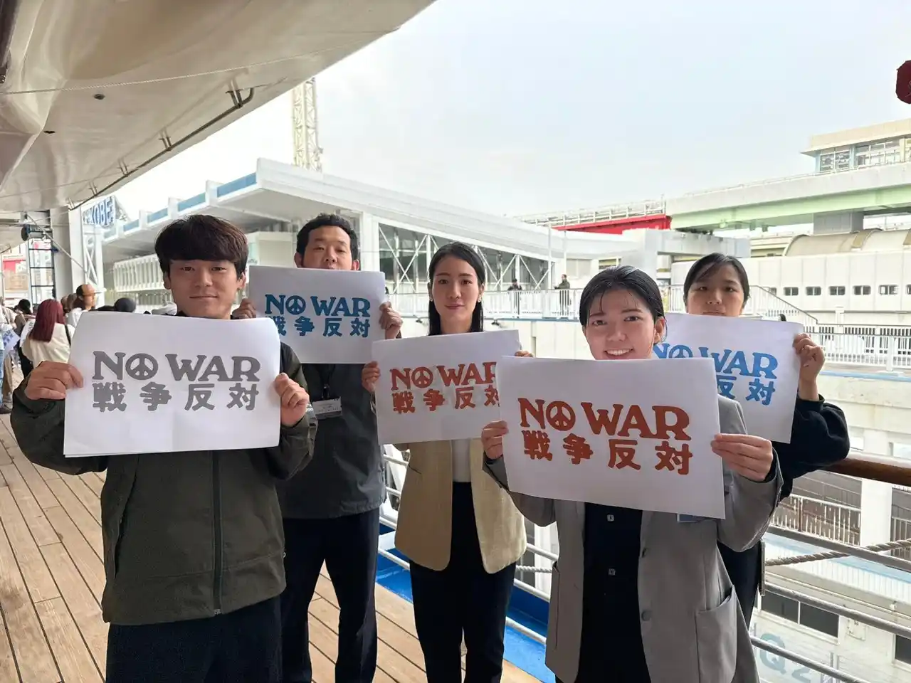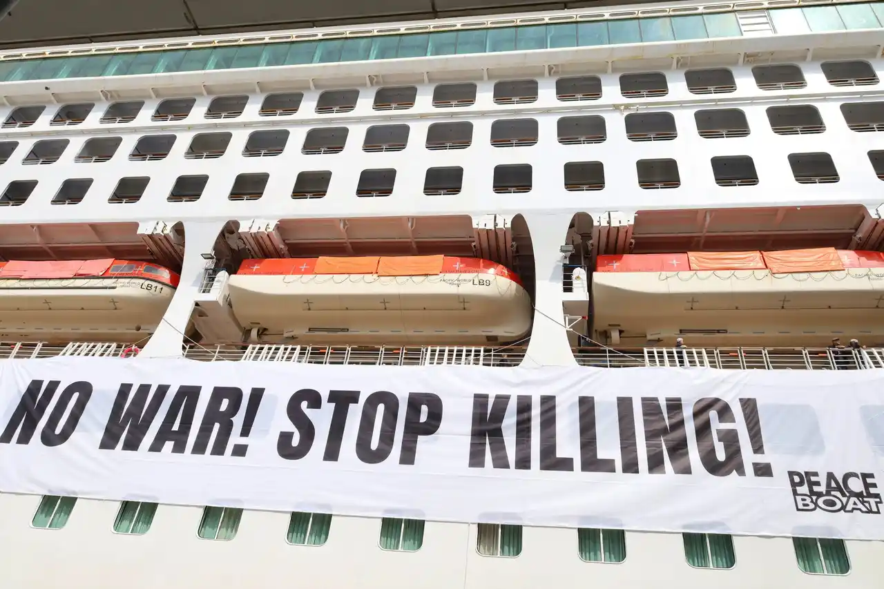神戸入港時、船体には「NO WAR! STOP KILLING!」と書かれた30m×5mの巨大なバナーが掲げられました。これに合わせてデッキには約300人の船旅参加者が集まり「NO WAR / 戦争反対」を訴えました。 |