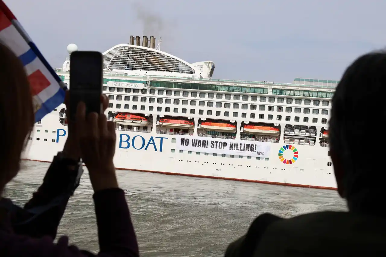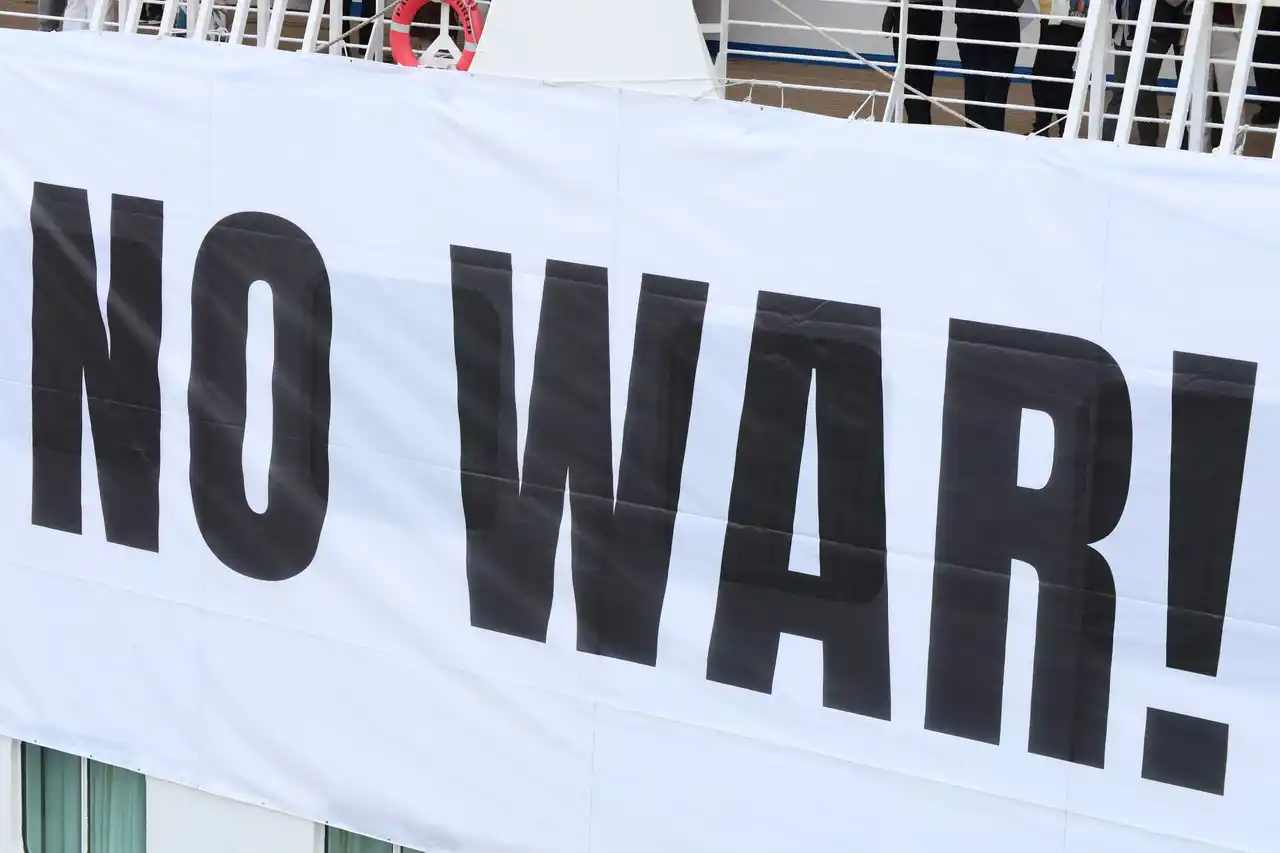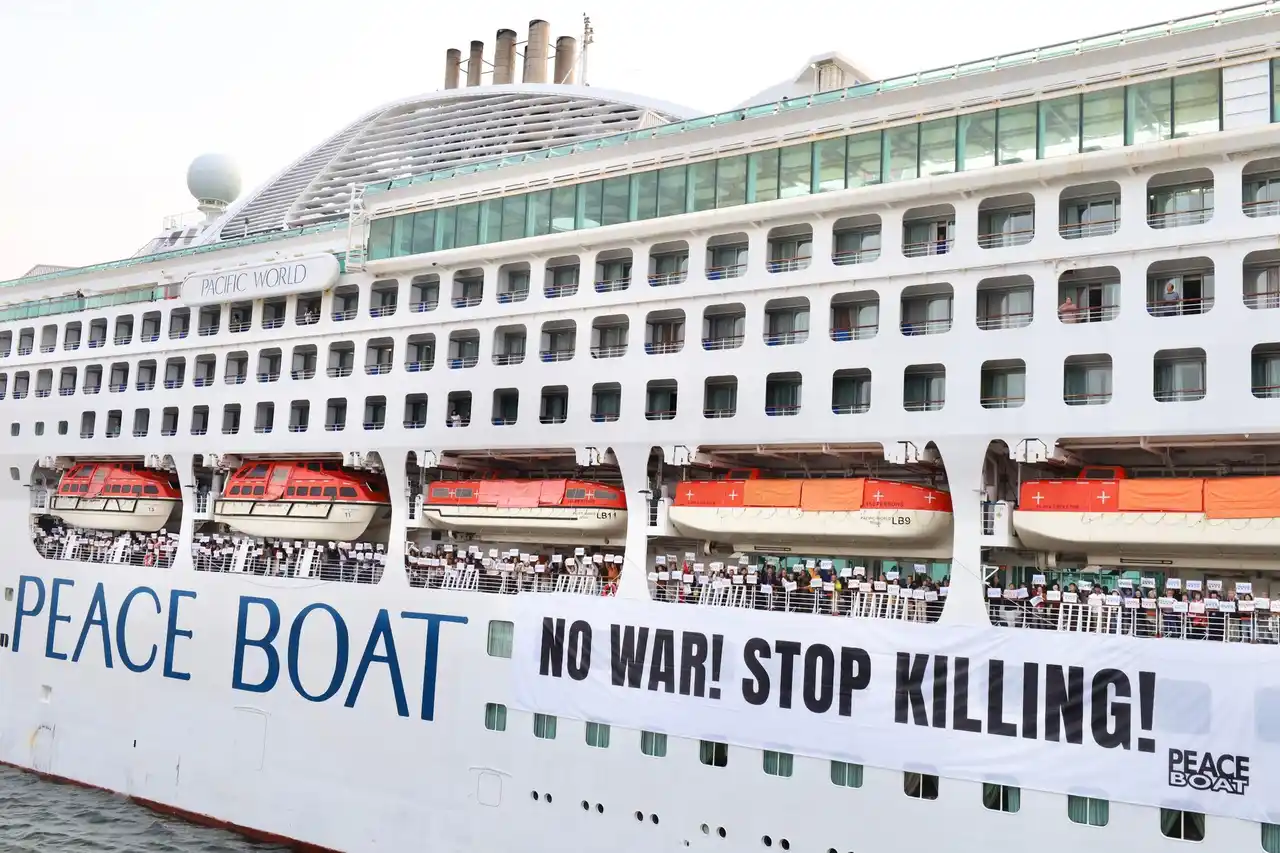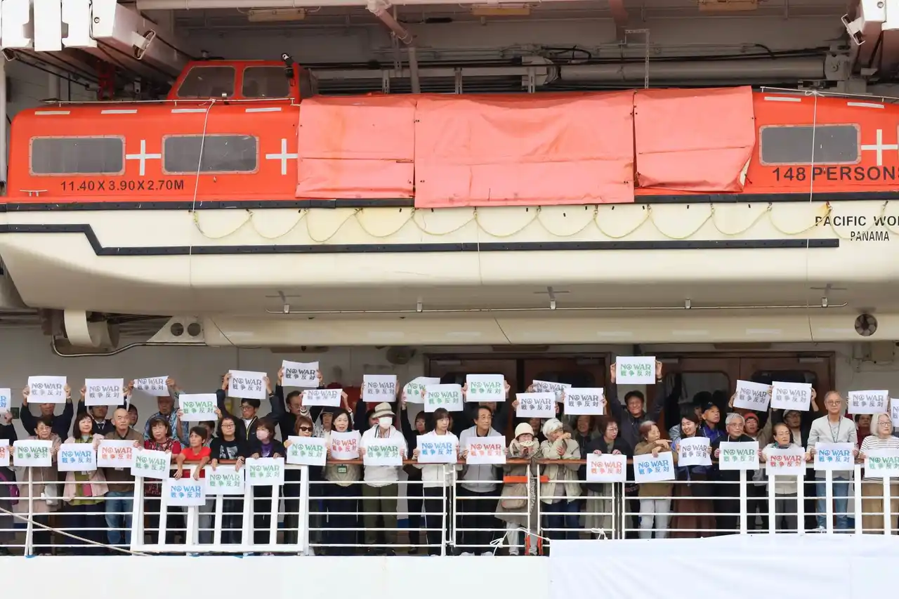 神戸入港時、船体には「NO WAR! STOP KILLING!」と書かれた30m×5mの巨大なバナーが掲げられました。これに合わせてデッキには約300人の船旅参加者が集まり「NO WAR / 戦争反対」を訴えました。 |
