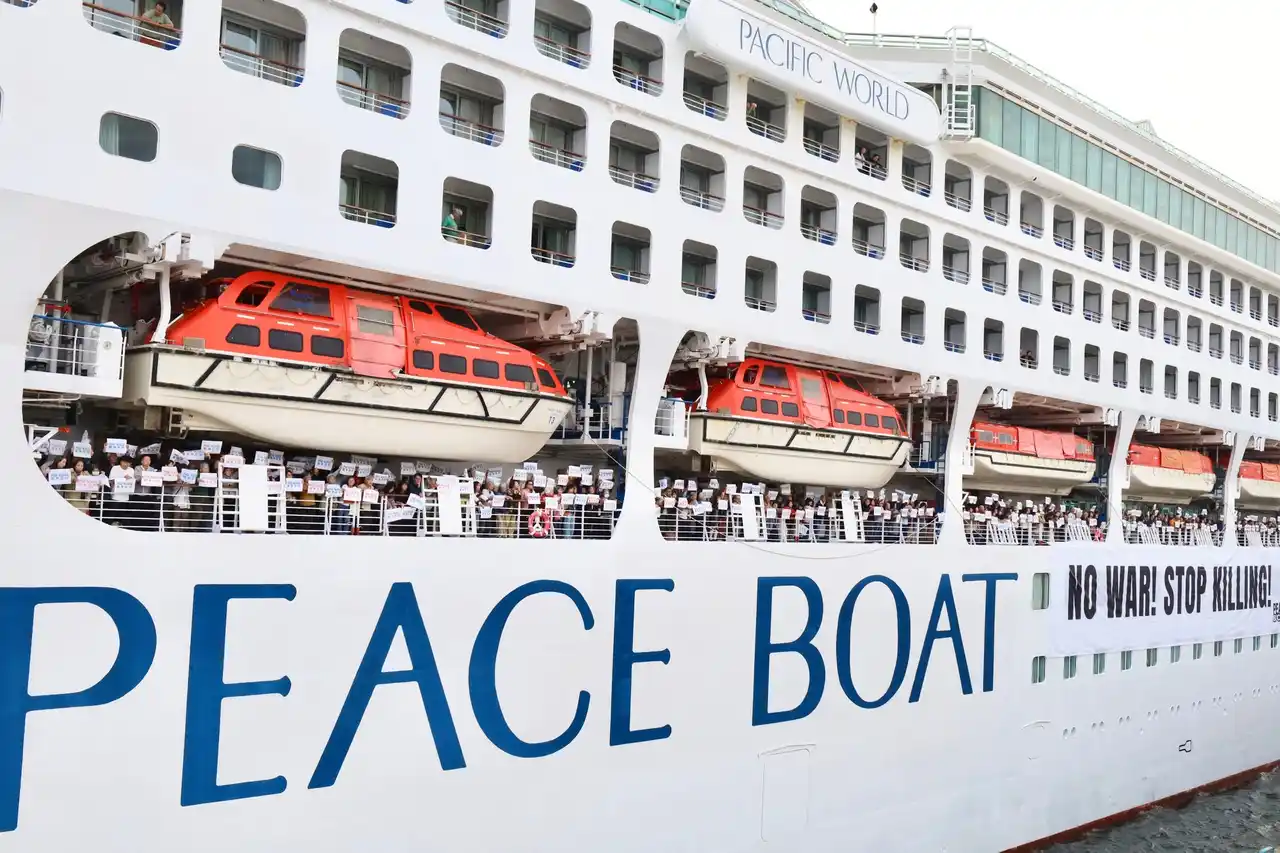 本クルーズでは、昨年の「戦後80年」特別プロジェクトを引き継いで、「TIME FOR PEACE」を掲げてさまざまなプロジェクトを行いました。核廃絶のテーマでは、日本被団協の和田征子事務局次長が乗船して証言したほか、ノーベル平和賞洋上特別展の実施、タヒチの先住民から太平洋の核被害を学ぶ講座も行いました。 |