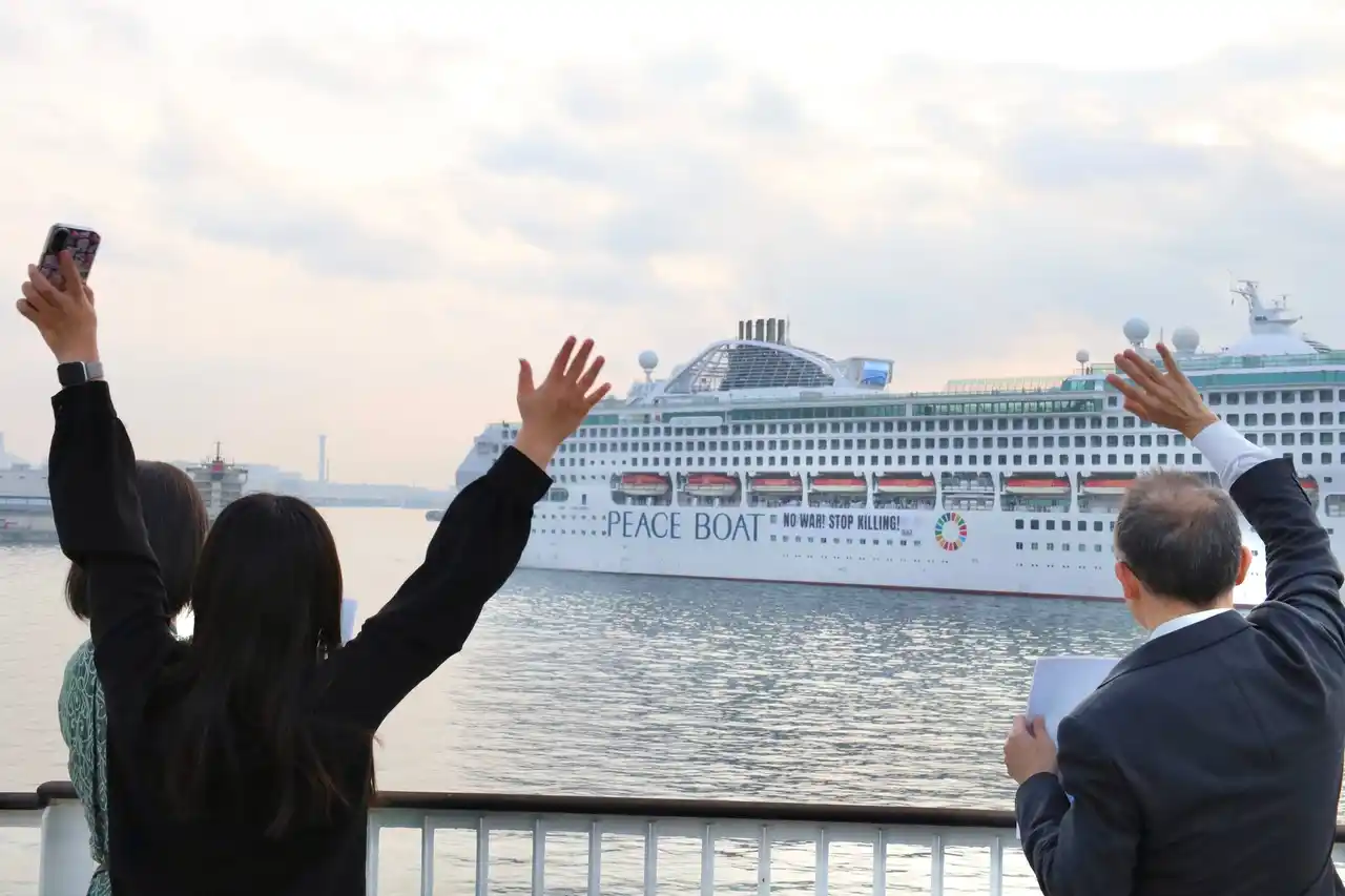船上から手を振る日本被団協の和田征子事務局次長 |