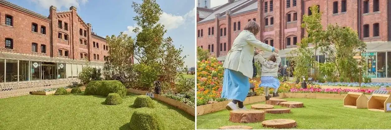 昼は、日の光に輝くカラフルな花々と、木製の遊具でお子様も遊べるプレイエリアが春の明るい雰囲気を際立たせます。夜は、花畑や横浜赤レンガ倉庫がライトアップされ、幻想的で美しい景色が広がります。“芝生で作られたベンチ”や、“大人も寝転べる丘”があるため、リラックスしながら、昼と夜でそれぞれ異なる表情をお楽しみいただけます。 |