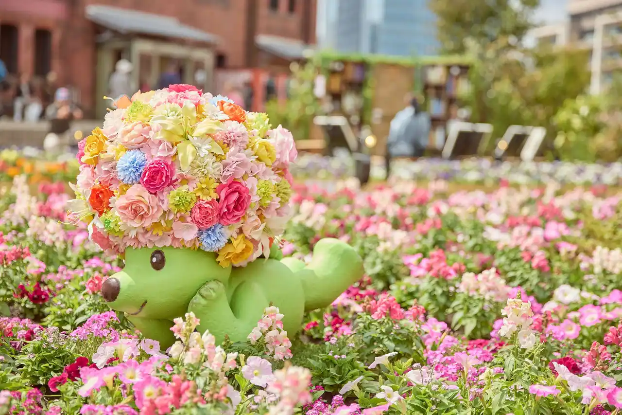 『FLOWER GARDEN 2026』では、連携施策として横浜赤レンガ倉庫のイベント会場内に、ガーデンネックレスのマスコットキャラクター「ガーデンベア」のオブジェが今年も登場します。訪れる皆様をお出迎えする会場入り口に、お馴染みオブジェに加え、イベントテーマ「Take a Break」にちなみ、「ガーデンベア」のリラックスしたレアな姿でも登場します。 |