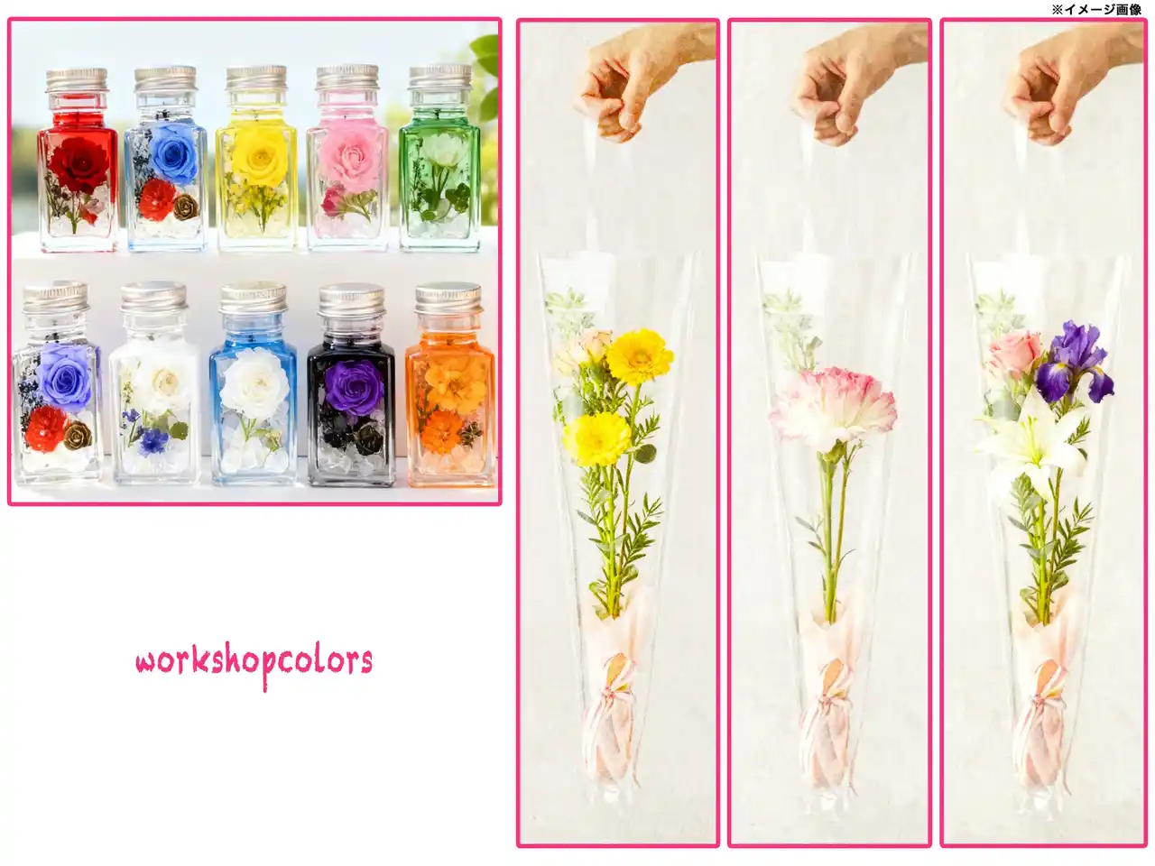 「フラワーロス」問題の解決に貢献。好きなお花をフラワーブーケバッグに入れて、世界に一つだけの花束を作ったり、推しの色のプリザーブドフラワーやドライフラワーをチョイスして、オイルと一緒に瓶に閉じ込めるインテリア雑貨「推し色フラワーボトル」をご用意。 |
