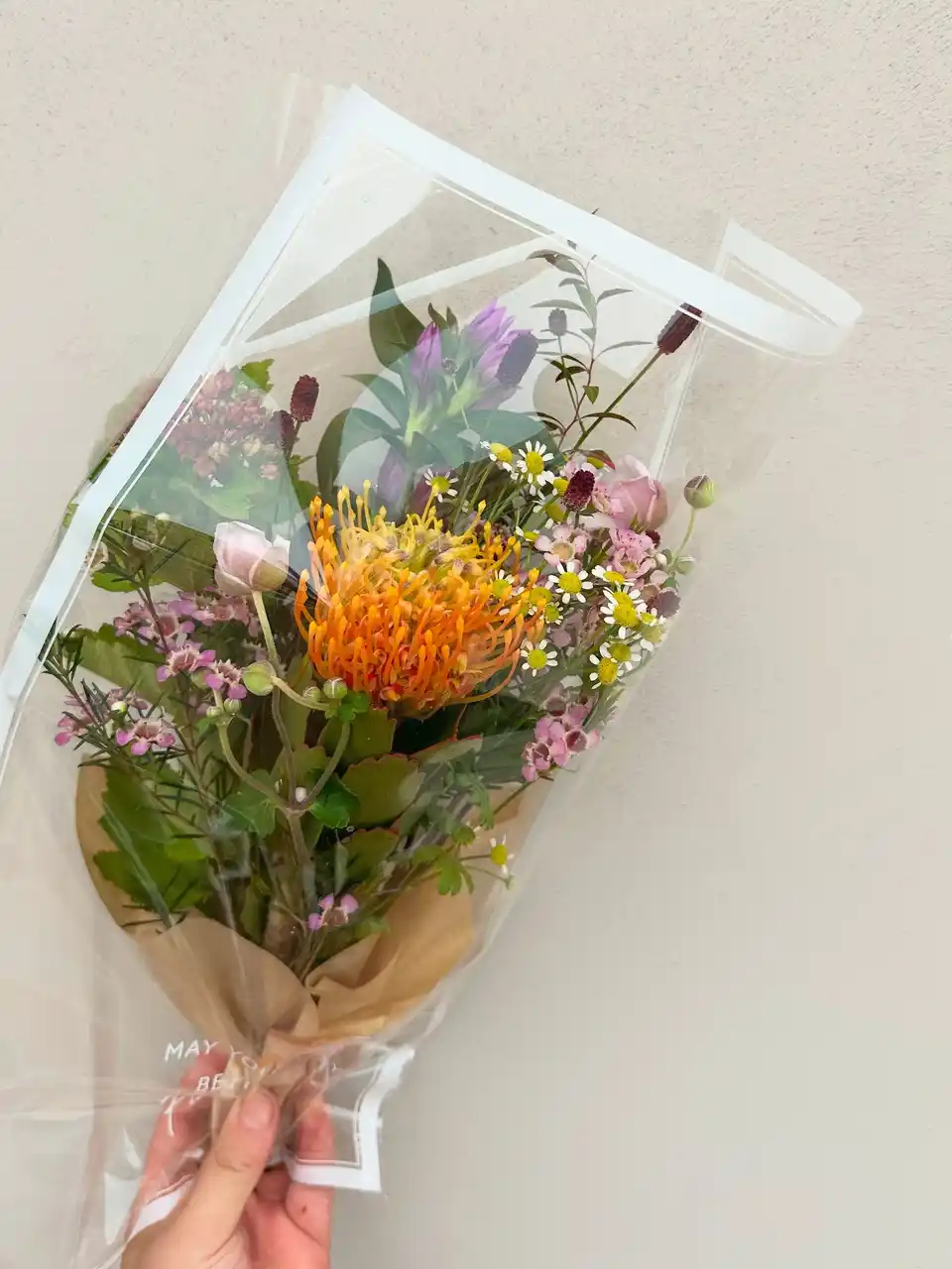 お花を選んだ後、ひとつにまとめてアレンジし、 持ち歩いても気分が上がるような可愛らしいパッケージでお渡しします。 |