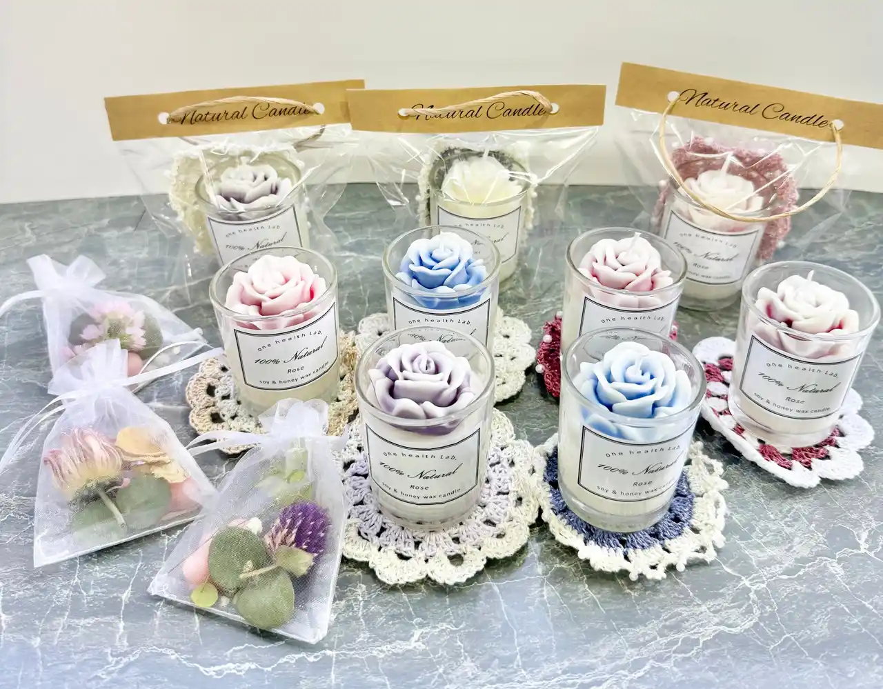 ミツロウと大豆ワックスで作られたローズキャンドル。天然精油の香りと自然素材の力で、空間と心に上質な癒しを届けます。 |