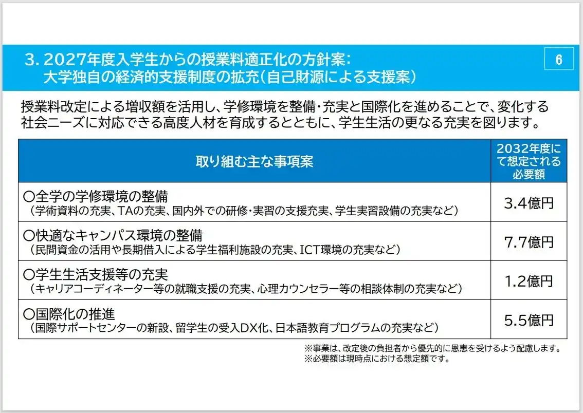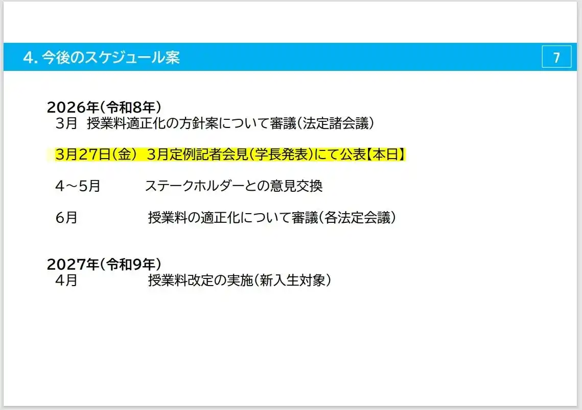 今後、ステークホルダーの皆さんと意見交換を行い、いただいたご意見を踏まえ、改めて授業料適正化(案)を提示し、審議する予定です(本日の内容は、最終決定の公表ではなく、あくまでも「2027年度入学生からの授業料適正化の方針案」です)。 |