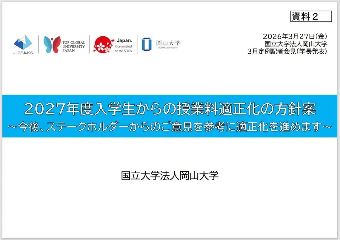 | 国立大学法人岡山大学(本部:岡山市北区、学長:那須保友)は、2026年3月27日の定例記者発表(学長発表)において、学内の法定会議等を経て取りまとめた「2027年度入学生からの授業料適正化の方針案~今後、ステークホルダーからのご意見を参考に適正化を進めます~」を公開しました。 | |||||