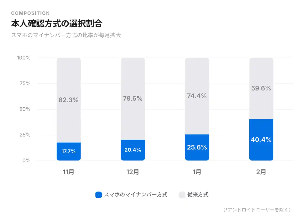 また、現在では口座開設時にスマホのマイナンバーによる本人確認を選択するユーザーの割合が、従来のJPKI方式を上回っており、ユーザー自身がより便利な手段を積極的に選択していることが分かります。 |