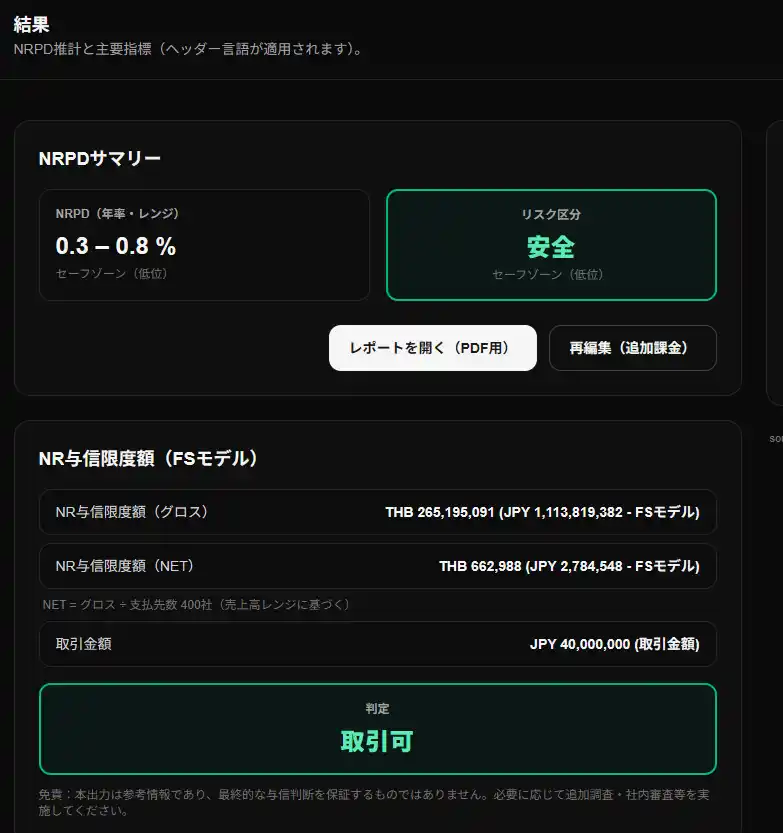 決算書は読める。財務数値も確認できる。それでも、「この取引を進めていいか」という問いに、自信を持って答えられているだろうか。株式会社中村格付研究所(本社:神奈川県川崎市、代表取締役社長:中村裕幸)は、国内外を問わず全世界企業の決算書PDFをもとに、財務分析から与信限度額の算出・取引判定までを一連の流れで支援するWebアプリ「NRPD Web App」を、2026年4月1日に提供開始します。 |