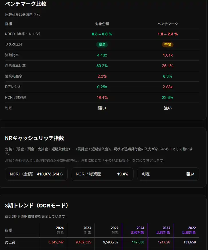 競合他社や同業他社など、利用者自身が選んだ企業の決算書PDFをあわせてアップロードすることで、NRPD、財務指標、NCRI(キャッシュリッチ指標)などを対象企業と並べて比較できます。単独評価では見えにくい相対的な強み・弱みを可視化し、判断の納得感を高めます。 |