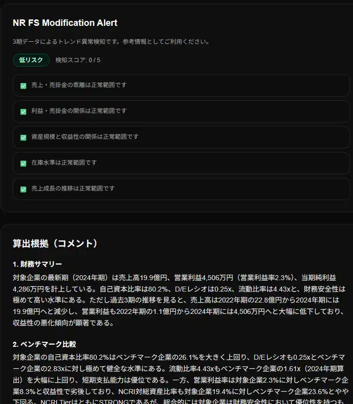 複数期の決算データを比較し、売上と売掛金の乖離・純利益に対する売掛金急増・資産急膨張・在庫比率急増・短期借入金急増など7項目の観点からアラートを表示します。与信判断の前提となる財務数値に違和感がないかをあわせて確認できます。さらに、財務サマリー・ベンチマーク比較・NRPD算出根拠・粉飾リスク解釈・NCRI・与信限度額の根拠・取引判定の7カテゴリーでコメントを整理し、数値の背景と注意点を文章で補足します。結果を鵜呑みにせず、比較と文脈を踏まえて判断しやすい設計としています。 |