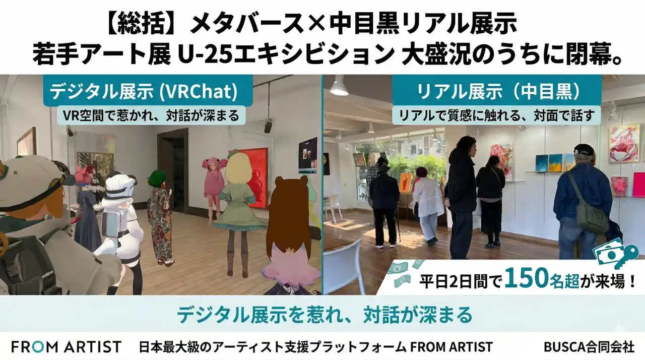 | 日本最大級のアーティスト支援プラットフォーム「FROM ARTIST」を運営するBUSCA合同会社(本社:茨城県水戸市、代表:戸井田翔馬)は、メタバース空間(VRChat)と中目黒のリアルギャラリーを連動させて開催した「FROM ARTIST U25エキシビション」の全日程を終了いたしました。 |