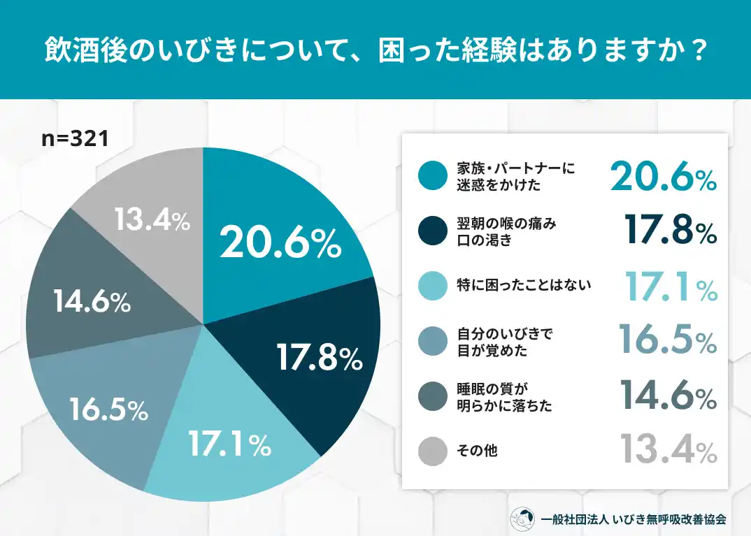 飲酒後のいびき悪化: 半数以上(53.5%)が、飲酒した夜にいびきが「ひどくなる」と自覚・指摘 |