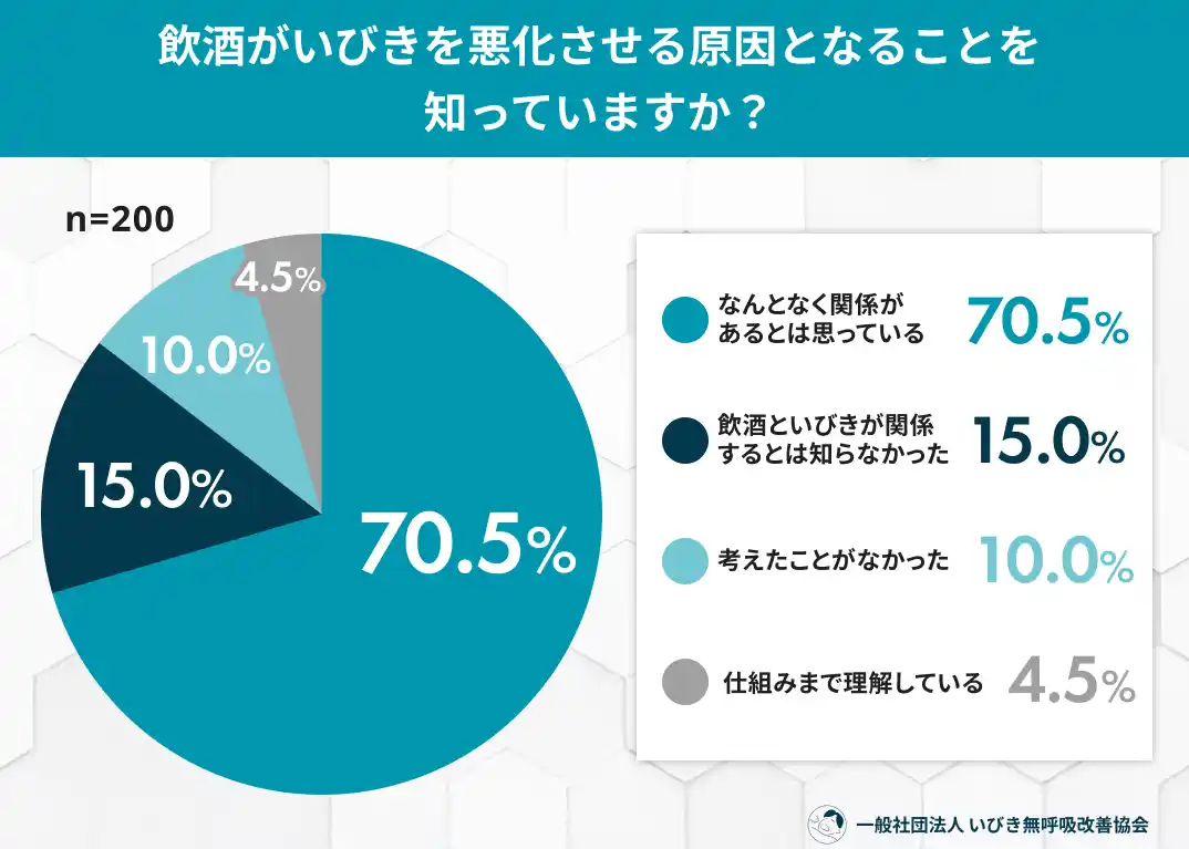 3月から4月にかけて、職場やプライベートでの歓送迎会が増えるシーズンが到来します。楽しいお酒の席の翌朝、「昨日のいびき、すごかったよ」と指摘され、気まずい思いをした経験はないでしょうか。一般社団法人 いびき無呼吸改善協会は、20代~60代の飲酒習慣がある男女200名を対象に「飲酒といびきに関する実態調査2026」を実施しました。その結果、半数以上の人が飲酒後のいびき悪化を自覚している一方で、その仕組みを正しく理解している人はわずか4.5%にとどまるという、深刻な「知識の乖離」が浮き彫りになりました。 |