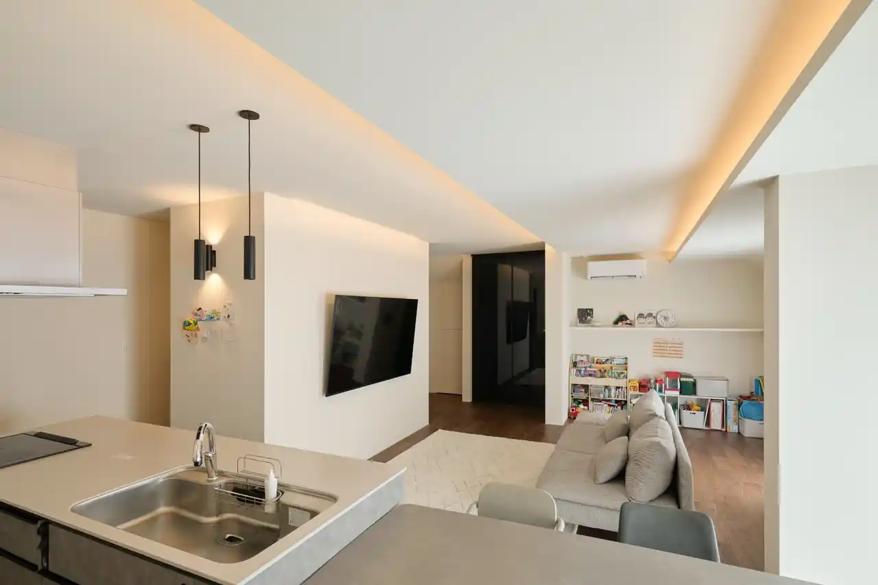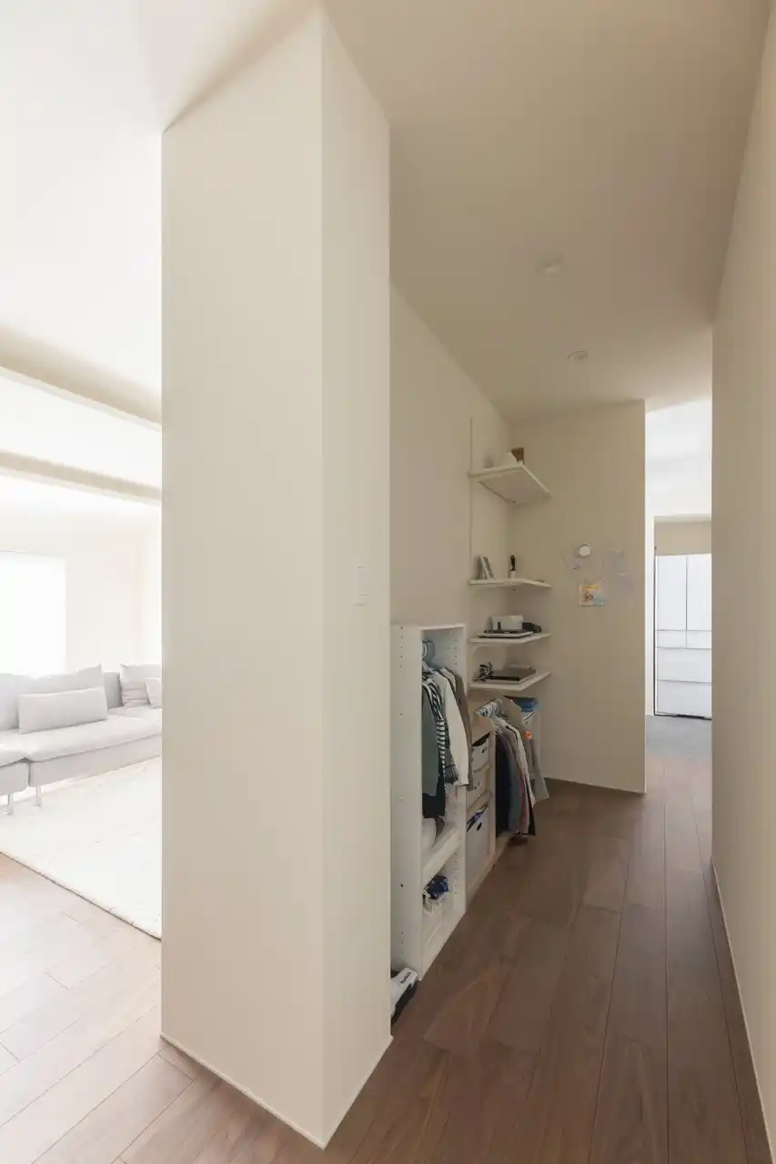 「もっと広く、のびのび過ごしたい」という願いを、構造から見直すことで叶えました。柱の数を最小限にすることでキッチンから窓まで視線がスッと抜け、実際の広さ以上の開放感を感じられます。家族の気配を感じながらも、それぞれがゆったりと寛げる、心地よい距離感のデザインです。 |
