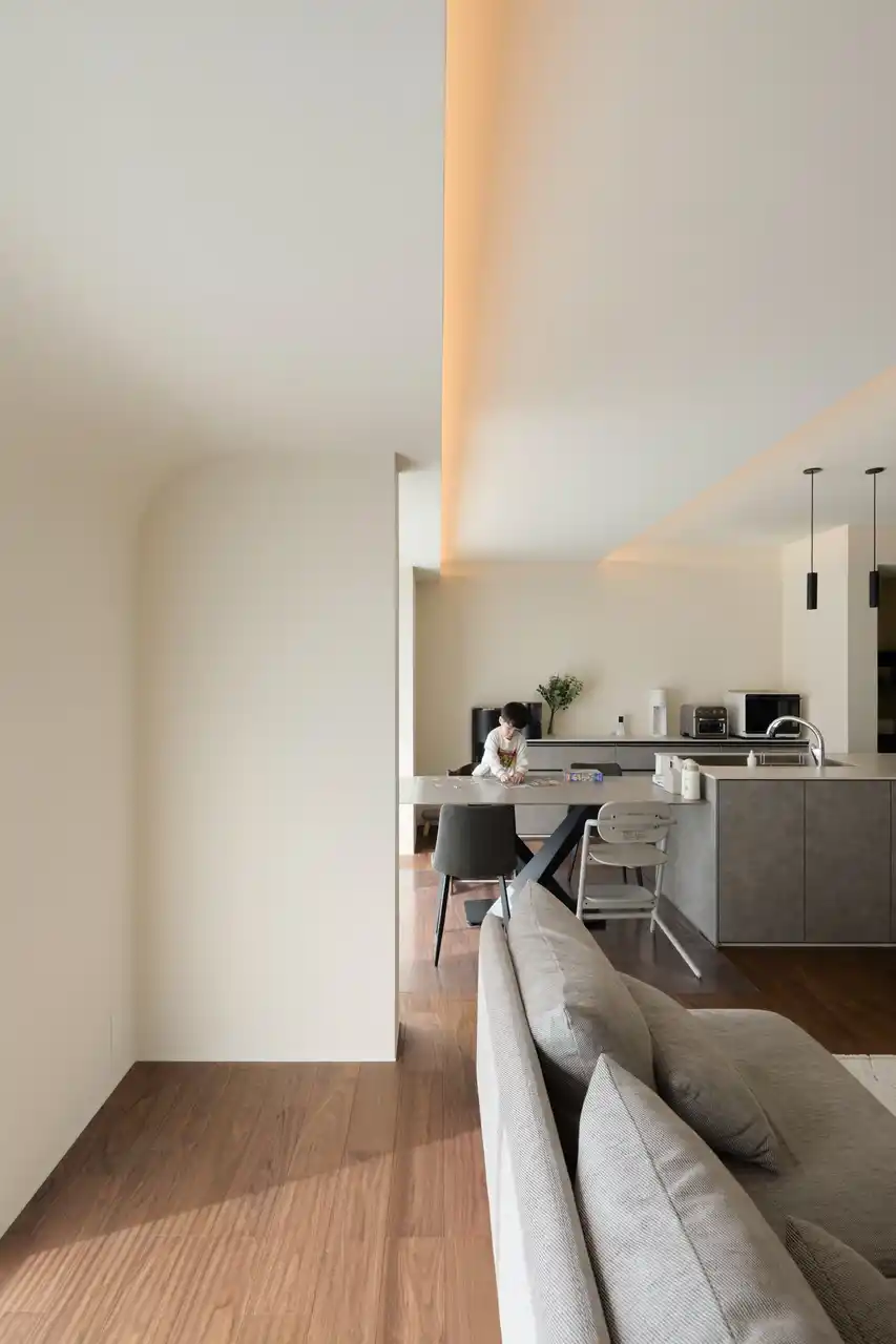 「ダウンライトは使わない」というこだわりから、天井そのものを「光の器」とするR天井を採用。緩やかなカーブを描く天井から、柔らかな光が部屋全体を包み込みます。まるでホテルのような、落ち着きのある空気感が広がります。 |