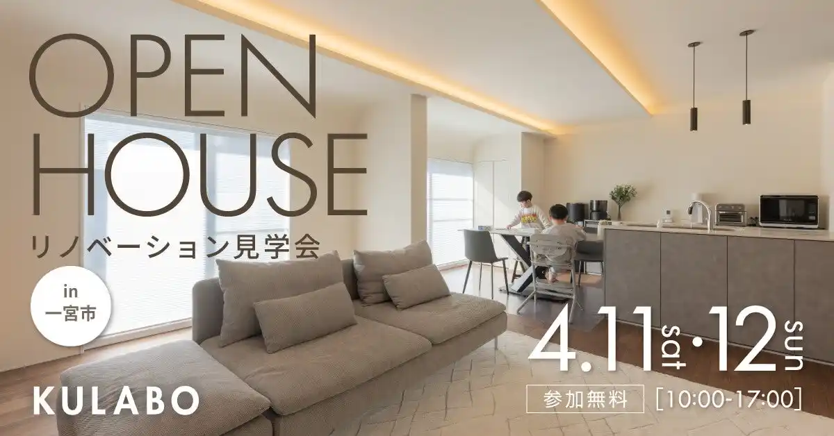 愛知県・岐阜県・東京都(一部エリア除く)でリノベーション事業を展開する株式会社sumarch(本社:愛知県名古屋市中村区、代表取締役:鳥居儀彰、以下KULABO)は、戸建てリノベーション見学会を2026年4月11日(土)、12日(日)に愛知県一宮市にて開催いたします。 |