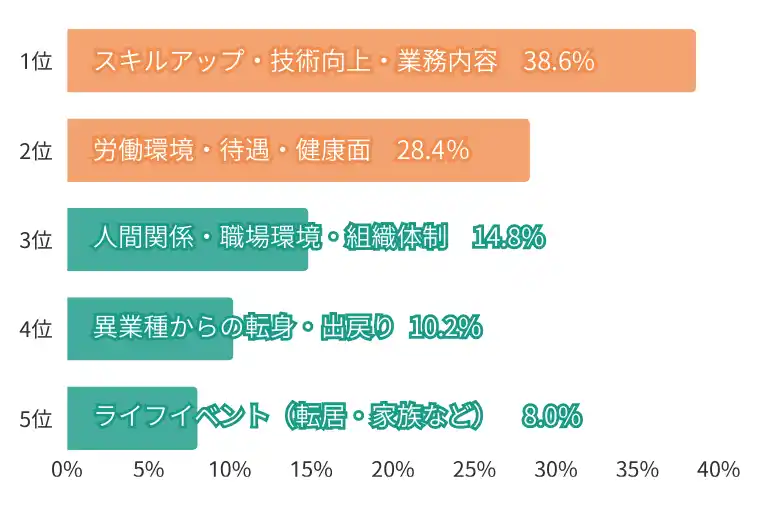 | ・3位「人間関係・職場環境・組織体制」、4位「異業種からの転身・出戻り」、5位は「ライフイベント」働き方や人生設計に関わる理由も上位に。 | |||