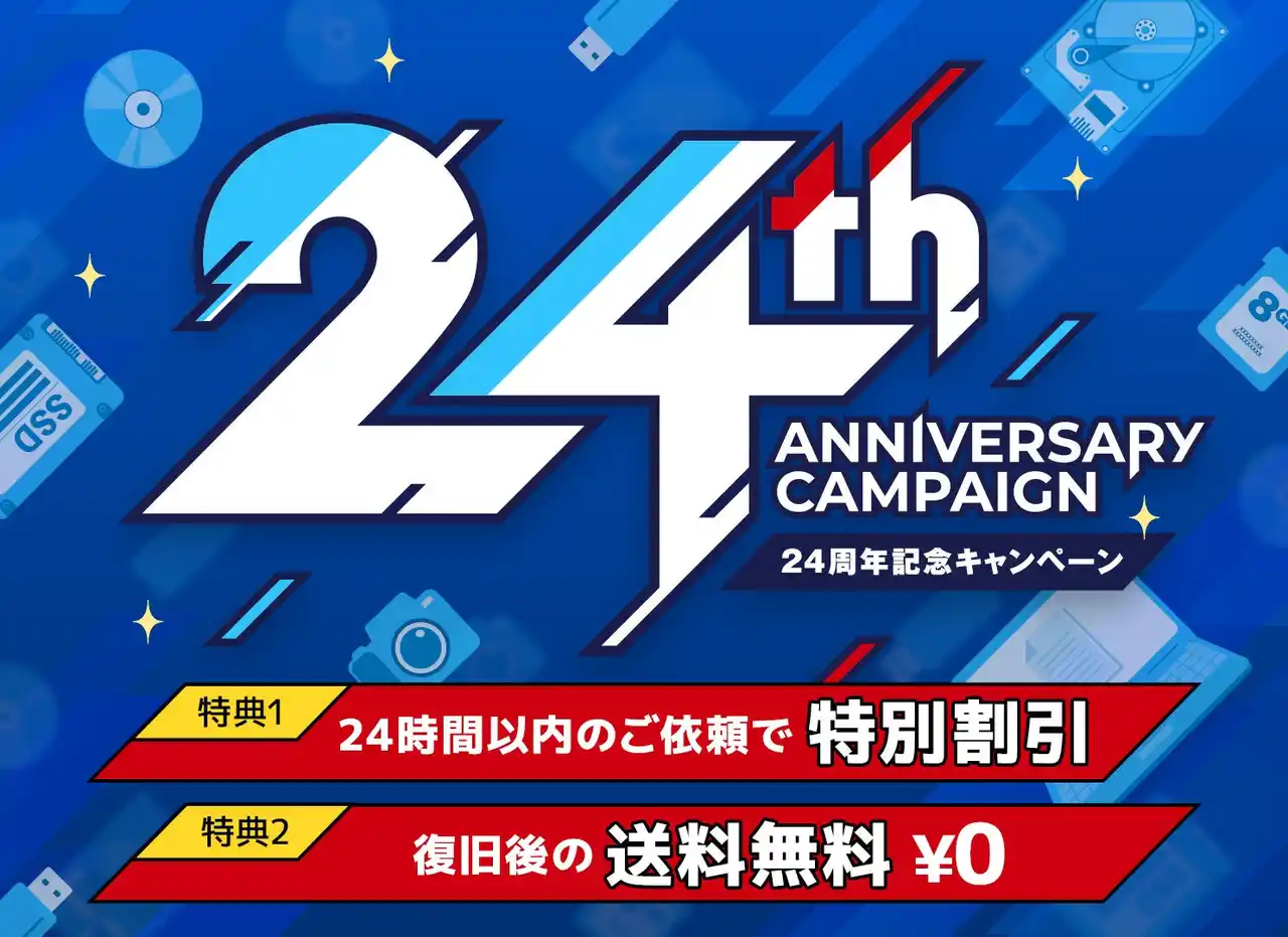 | 株式会社アラジン(本社:福岡県福岡市、代表取締役:長濱 慶直)が運営する「データレスキューセンター」は、2026年5月をもちまして会社設立24周年を迎えます。これまでのご愛顧に感謝し、24周年記念キャンペーンを実施いたします。 | |||