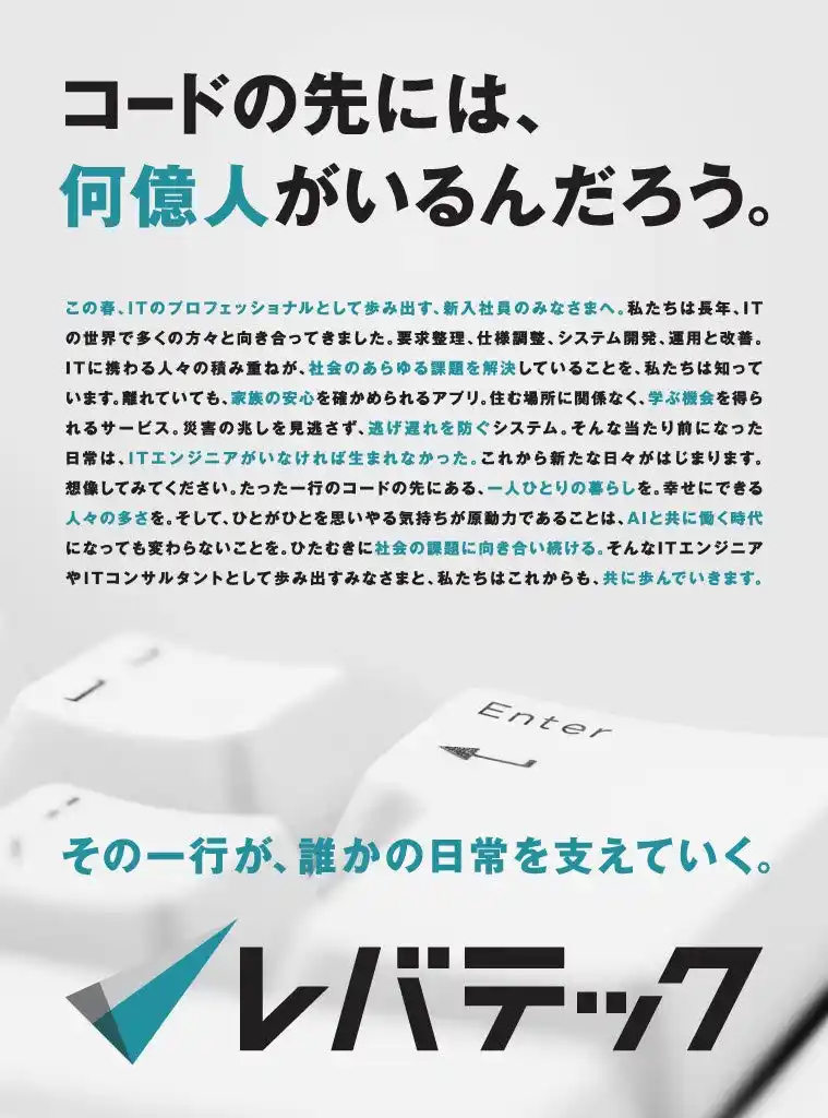 「日本を、IT先進国に。」をビジョンに掲げるレバテック株式会社( https://levtech.jp/ )は、2026年3月31日(火)の日本経済新聞(全国版)にて、ITエンジニアとして社会人の第一歩を踏み出す新入社員に向けたメッセージ広告を掲載します。 |