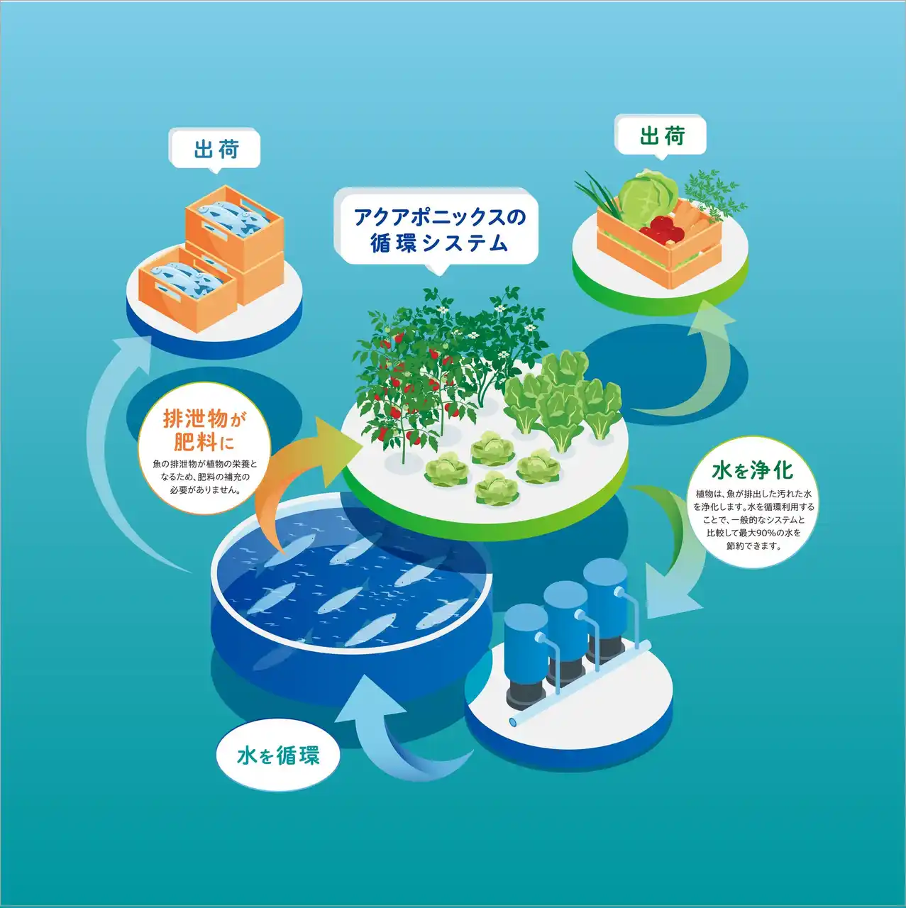 魚の排泄物を植物の栄養に変える究極の資源循環システムは、環境負荷を抑え、安心・安全な食料を届けるサステナブルな仕組みです。 |