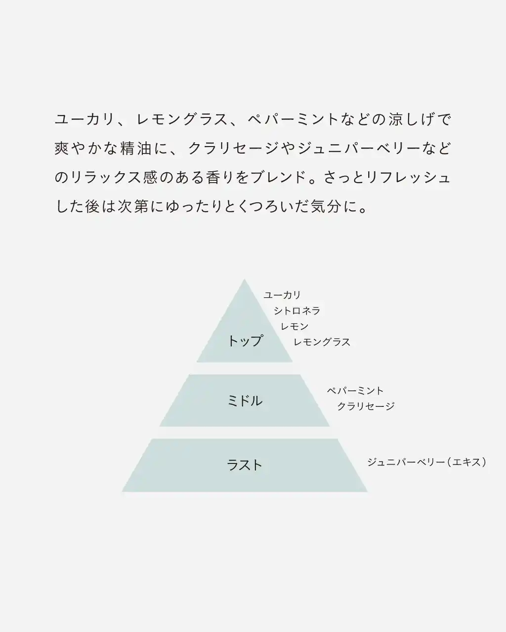 香り成分に精油と植物エキスを使用。ユーカリ、レモングラス、ペパーミントなどの涼しげで爽やかな精油に、クラリセージやセイヨウネズ果実/枝/葉エキス(ジュニパーベリー)などのリラックス感のある香りをブレンド。さっとリフレッシュした後は次第にゆったりとくつろいだ気分に。 |