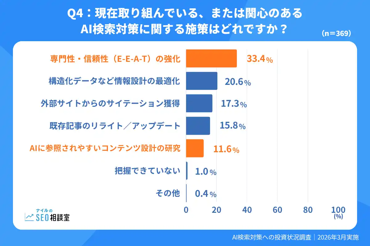 | 中でも「専門性・信頼性(E-E-A-T)の強化」が突出している点は、AI検索においても、発信元の信頼性や情報の確かさが重要だと、多くの企業が認識していることを示しています。 | |||||||||||||||