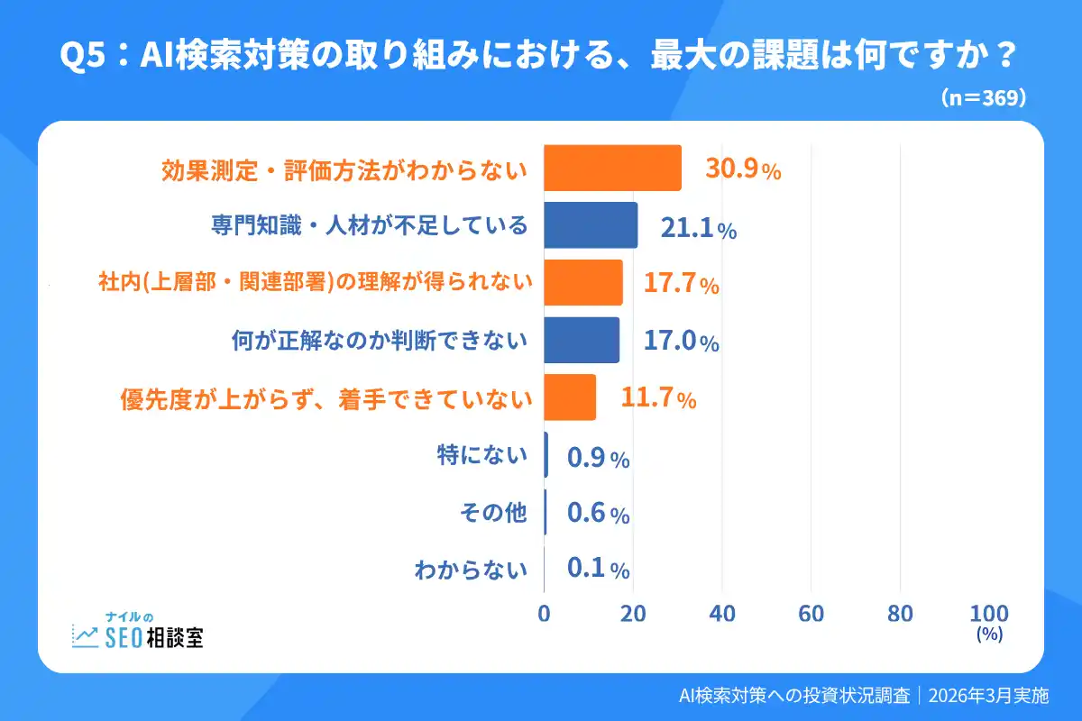 | AI検索対策の取り組みにおける、最大の課題は何ですか? | |||||||||||||||