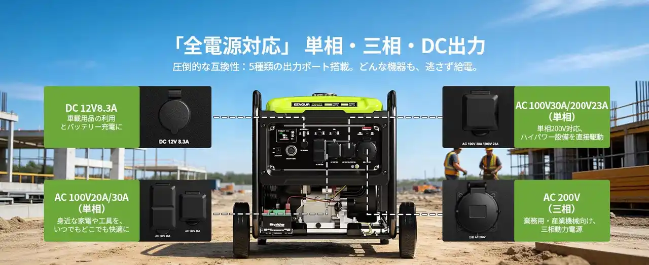 | 近年、電力需給の逼迫や使用シーンの多様化に伴い、発電機には「使える」だけでなく、さまざまな場面で安定した電力供給が求められています。しかし、従来の切替式発電機では、単相と三相の出力差により、使用できる機器に制限が生じるケースも少なくありませんでした。 | |||||||||||||||||||