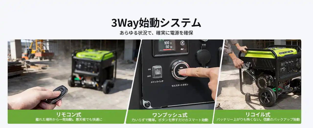 | GT8000iOTEは、リコイル始動、ワンプッシュ始動、リモコン始動の3種類に対応しています。使用シーンに応じた柔軟な操作が可能です。 | |||||||||||||||||||