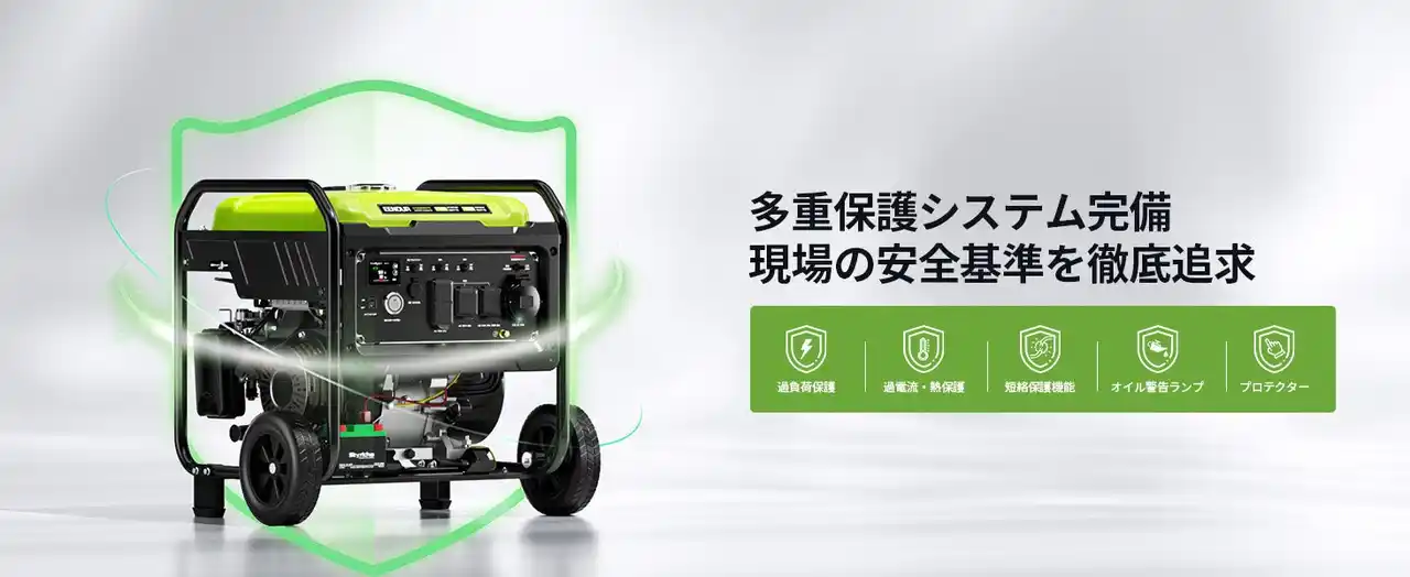 | GT8000iOTEは、過負荷、過電流、過熱、短絡に対応した多重保護機能を備えています。さらに、オイル警告ランプおよびプロテクターを搭載しています。 | |||||||||||||||||||