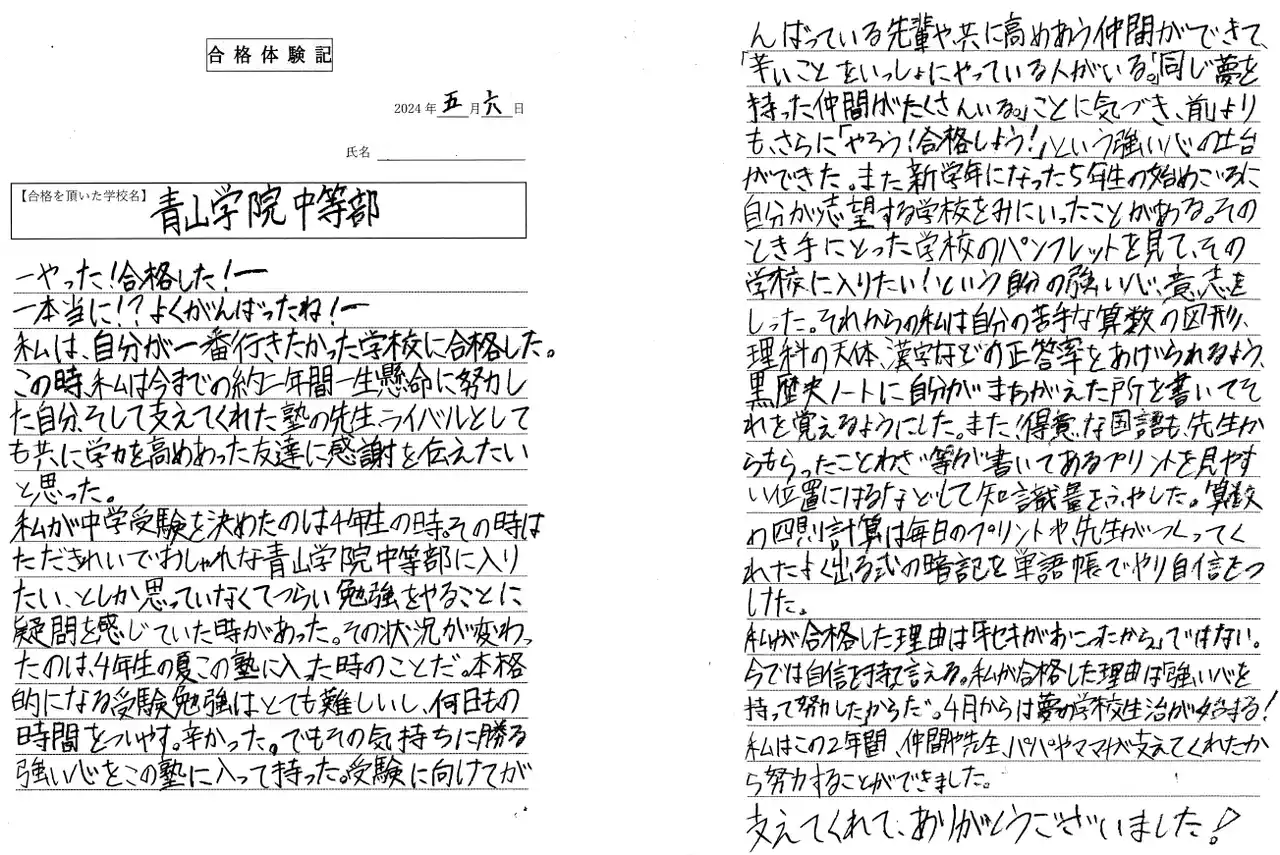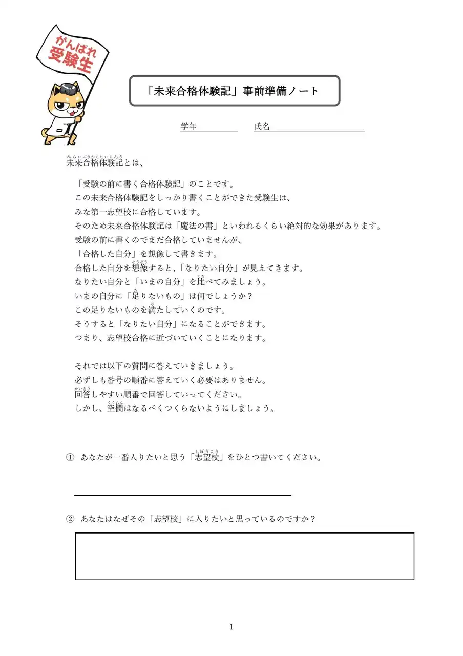 | 「未来合格体験記」は、受験本番前に“合格した自分”の視点で体験記を書くという手法です。 | |||||||||