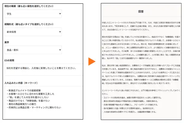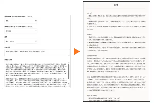 志望業界とESの質問、入れ込みたい内容やキーワードを入力するだけで、AIがES回答の“叩き台”を短時間で作成します。ES作成にかかる時間を削減し、就職活動における貴重な時間を、「自分の言葉」や「自分の思い」の整理に充てることができます。 |