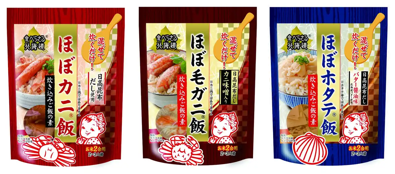 「ほぼカニ(R)飯 炊き込みご飯の素」「ほぼ毛ガニ(R)飯 炊き込みご飯の素」「ほぼホタテ(R)飯 炊き込みご飯の素」も絶賛発売中!