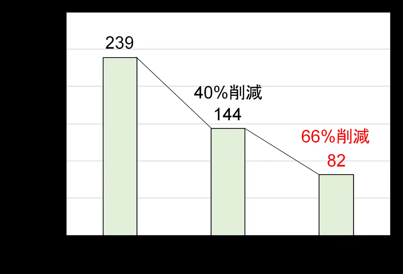 本工事では、ハイプロダクリートを高架橋下の舗装に適用しました。その結果、標準的に使用されている普通セメントと比較して、コンクリート工事のCO2排出量を66%削減することに成功し、日本が2035年度までの目標として掲げる温室効果ガス排出量60%削減※3の達成に寄与する効果を確認しました。また、施工時間についても従来比で約60%削減されました。これによって、「ハイプロダクリート」が研究開発段階とは異なる構造物に適用した場合でも、CO2排出量削減と施工の省力化を実現できることが実証されました。