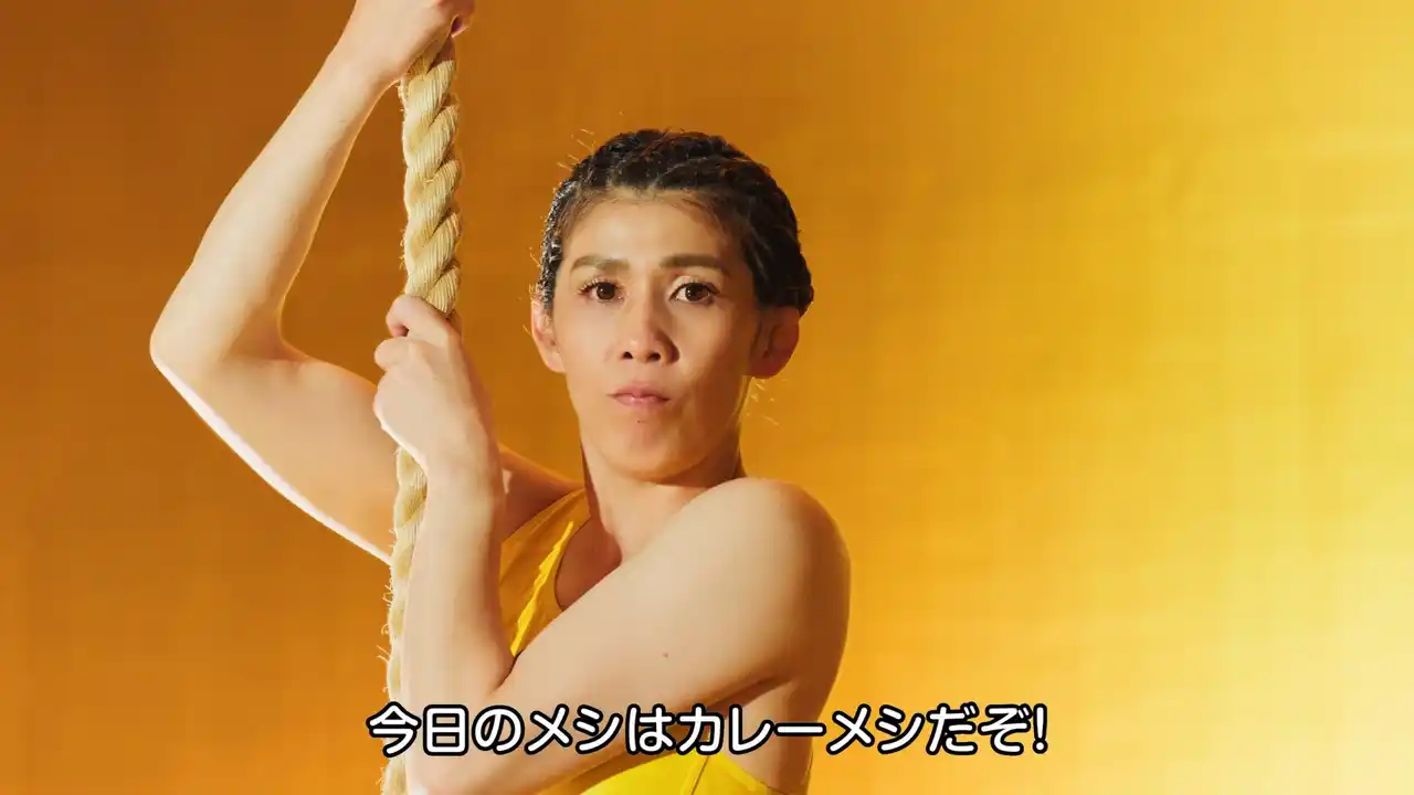 新CMでは、自身もギネス世界記録(TM)を保持する元レスリング選手の吉田沙保里さんが、現役時代を彷彿とさせる編み込みヘアに、「カレーメシ」カラーのオリジナル衣装を身にまとって登場。長い注ぎ口のやかんで「カレーメシ」にお湯を注いだり、現役時代に国際大会で優勝したときのように「カレーメシくん」を肩車するなど、さまざまなアクションを披露しています。さらに、初代CMに出演していた謎の高校生ギャル「なるみちゃん」こと大川成美さんが、ビジネスパーソン風の「なるみ主任」として登場。