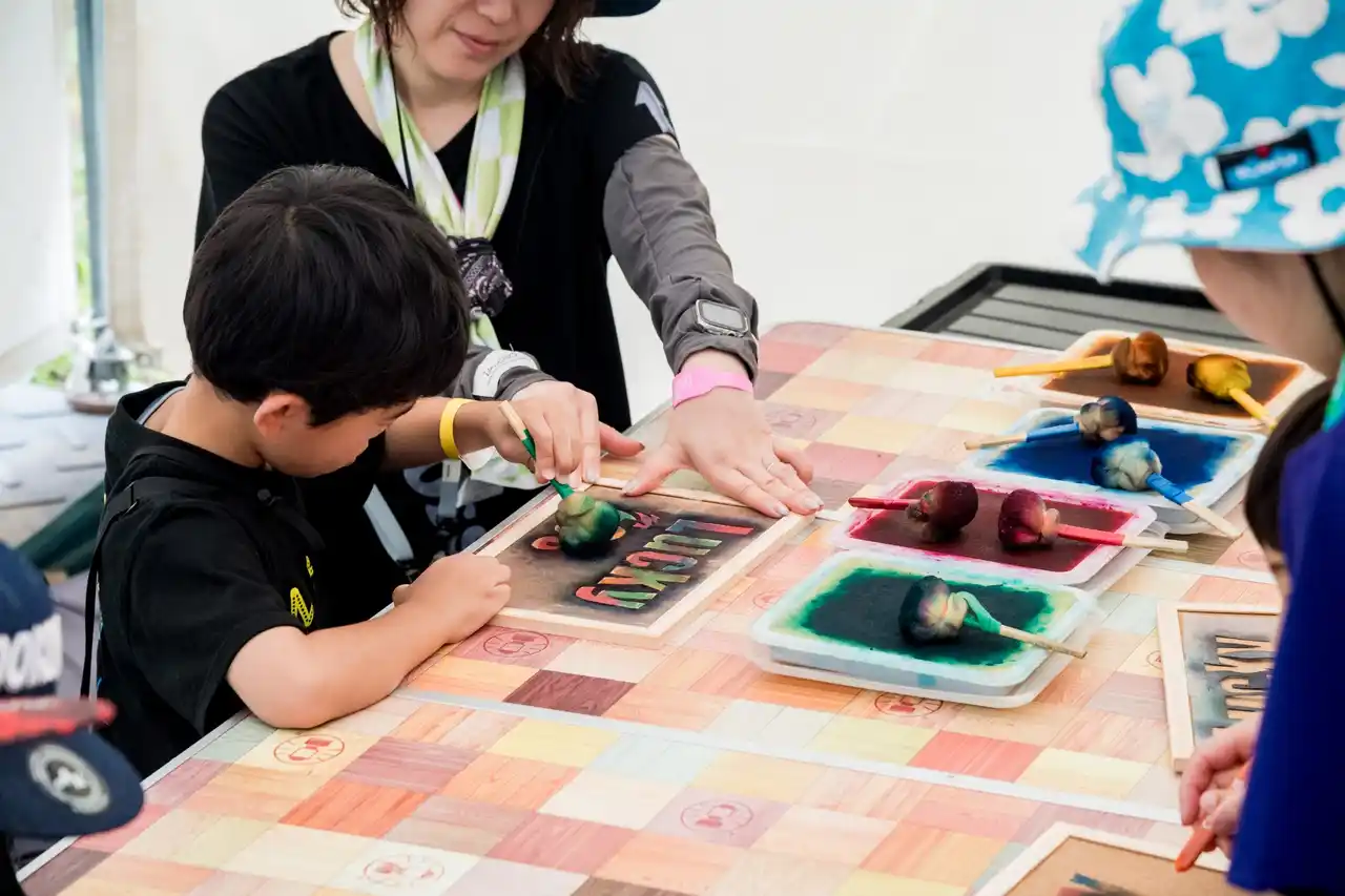 | これまでの“障がい者アート”や“アウトサイダーアート”とも違う、新しいアートのかたちを伝える展覧会をキッズエリア内で開催します。展示するのは重い脳性まひを持つ2人の若者が描いた作品。筆を持つことも、言葉で思いを伝えることも難しい彼らが、体の動きや感情をそのままキャンバスにぶつけて生まれた、心からのアートを、ぜひ自然の中で感じてみてください。また、展示会場では、来場者が自由に参加できる共同制作ワークショップも行いますので、子どもも大人も、世代も国籍も関係なく、その場で一緒に“描く”楽しさを分かち合いましょう! | |||||||||||||||||||||