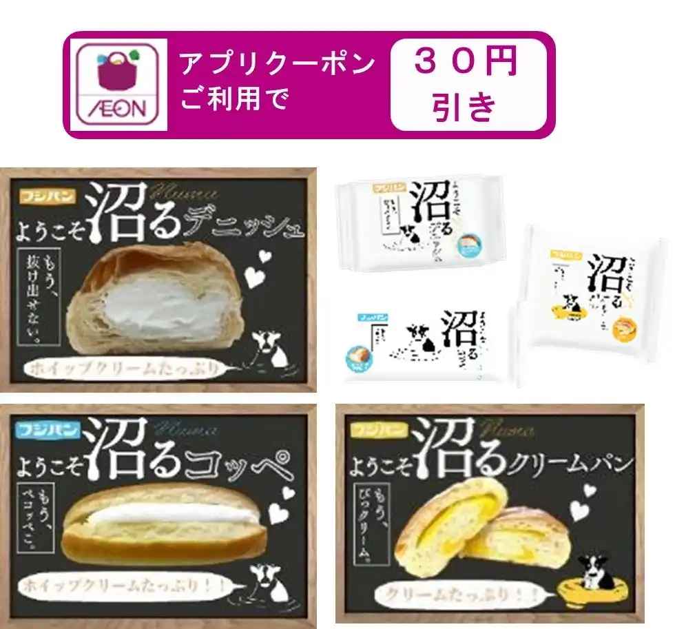 SNSで人気を集めるフジパンの沼るシリーズは、“やわらかさ”と“クリームのとろけ感”が特長の菓子パンシリーズで、クリーミーで“底なしにハマる”ような味わいが支持されています。今回のフェアでは、「沼るデニッシュ」「沼るクリームパン」「沼るコッペパン」をお買物アプリクーポンのご利用でお得に提供。シリーズならではの“とろけるおいしさ”を、よりお得にお楽しみいただけます。 |