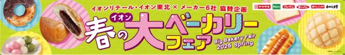 イオンは2026年4月1日(水)~4月7日(火)※1)、本州・四国の「イオン」「イオンスタイル」、東北の「イオンスーパーセンター」「マックスバリュ」の約550店舗※2)にて「春の大ベーカリーフェア」を開催します。 |