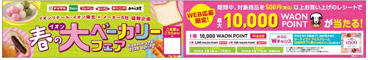 「イオン春の大ベーカリーフェア2026」では、協賛メーカー6社(山崎製パン、敷島製パン、フジパン、第一パン、YKベーキングカンパニー、あわしま堂)の対象商品を税込500円以上お買い上げいただくと、最大当選額 過去最高となる10,000 WAON POINTやデジタルギフトが当たる応募企画を実施します。 |