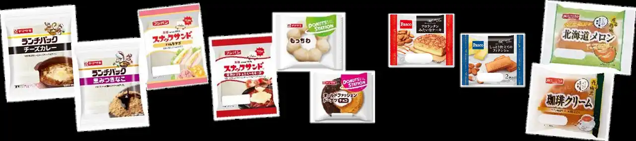 商品の一例(画像左から)「ヤマザキ ランチパックシリーズ」「フジパン スナックサンドシリーズ」「ヤマザキ ドーナツステーションシリーズ」「パスコ 満たされスイーツシリーズ」「あわしま堂 和菓子」「YKベーキング 丹念熟成シリーズ」 |