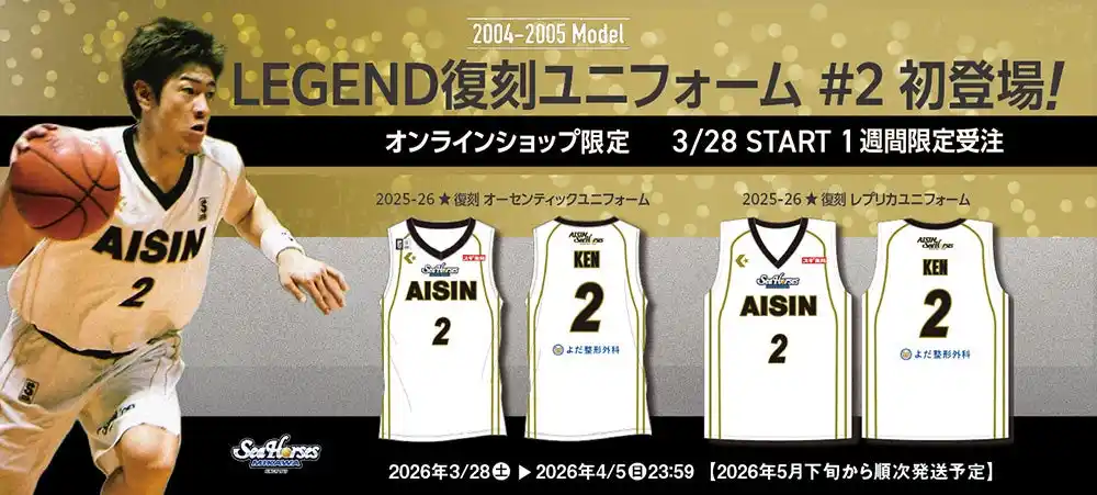 この度、3月28日(土)、29日(日)の川崎ブレイブサンダース戦で着用する『復刻ユニフォーム』の特別背番号2番『KEN』を試合当日の3月28日(土)~オンラインショップにて、受注限定販売することになりました。 |