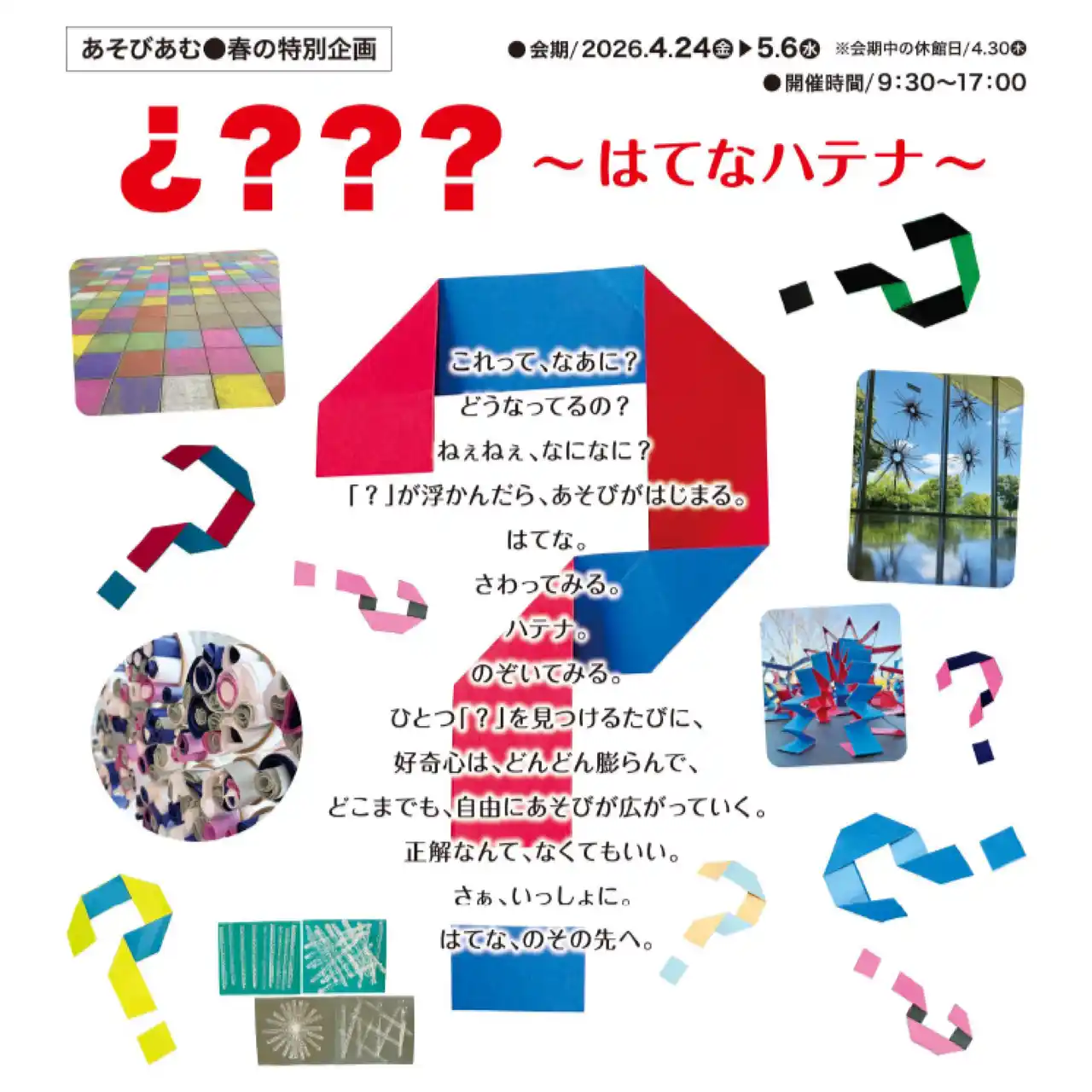 舞鶴市子育て交流施設あそびあむ(舞鶴市字浜)にて、令和8年4月24日(金)から5月6日(水)まで、こどもの好奇心や想像力を引き出す体験型イベント、春の特別企画「¿???~はてなハテナ~」を開催します。 |