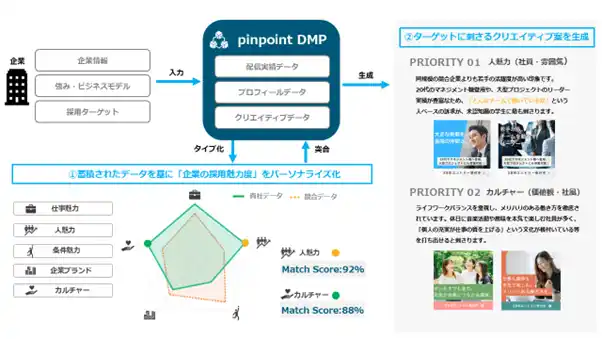 | 当社はこの考えのもと、アドテクノロジー商品「pinpoint」の開発・提供を通じて蓄積してきた独自のデータ基盤と分析ノウハウを活用し、企業の採用活動全体を包括的に支援する新たなサービス群の開発に取り組んでまいりました。 | |||
